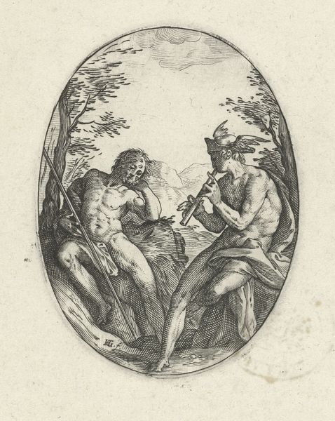 Curator: Ah, this tiny arena of cherubic conflict. There’s something unsettlingly precious about it. Editor: Indeed! This engraving, dating from somewhere between 1500 and 1600, is called "Medaillon met twee kinderen, gewapend met knotsen" or "Medallion with two children armed with clubs". It is made by an artist only known as Monogrammist HO. The Italian Renaissance influence is apparent, would you not agree? Curator: Italian Renaissance with a wink, perhaps. Mannerism loved its grotesques, and these belligerent babies feel a little like that, inflated and itching for a brawl. Like slightly terrifying cupids. Editor: Well, in Mannerism, beauty is often found in that very exaggeration and artifice. Think about the historical context: The Italian Renaissance was steeped in classical mythology, often depicting children as playful putti. However, socio-political unrest colored this view by the 16th century. Curator: Which comes through, here, right? This isn’t just playtime. It’s a fight for position. A bit… cutthroat, even, considering they are nearly newborns. Is it commentary or observation, I wonder? A reflection of social strife as seen through… infant eyes? Editor: Precisely. These weren't naive times. Wars, religious conflict… Images of conflict and power struggles, filtered through the safe remove of classical allusion, spoke volumes. This print may well have functioned as a satirical reflection of power dynamics. Curator: Makes you wonder about the little details, doesn't it? That vase behind them, the way the acanthus leaves frame their tiny rage. It is domestic but volatile, almost claustrophobic. Like bottled aggression, you could almost explode from that. Editor: Or a pressure valve; using classical references and the seemingly harmless imagery of chubby children to subtly critique the grown-up world. In essence, these seemingly decorative prints played a vital role in expressing opinions, fueling debates, and reflecting anxieties. Curator: Gives new meaning to "child's play", eh? Well, it reminds me not to underestimate what even the tiniest, sweetest-looking image can say, it’s easy to see an old thing as simply decorative, until one scratches beneath its veneer to reveal so much history of life, thought and purpose. Editor: Quite. And it showcases how even art can be a silent protest. Let us now continue.