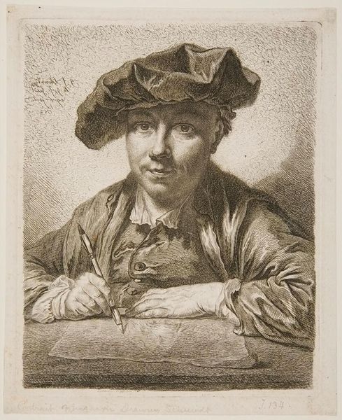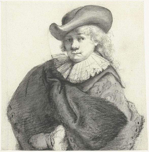 Curator: The somber intensity of this rendering immediately strikes me. Editor: Indeed. This print, "Rembrandt," by Carl Ernst Christoph Hess, made after a painting, captures a certain gravitas. Curator: Hess, working in the late 18th and early 19th centuries, is channeling Rembrandt, invoking the master's profound understanding of human psychology and emotion through pose and expression. Editor: And the materiality of the printmaking process itself—the lines etched into the metal, the pressure of the press—adds a layer of remove, a mediation of Rembrandt's original vision. There's an inherent labor involved that speaks to its own historical context. Curator: Precisely. It's a cultural echo, a memory of Rembrandt's genius filtered through Hess's own artistic sensibilities. Editor: A fascinating dialogue between artists, across time, expressed through labor and materials. Curator: The cultural weight of Rembrandt continues to resonate centuries later. Editor: A print that speaks volumes about artmaking itself.