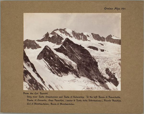 Curator: This is Vittorio Sella's "From the Herbetet Hut, Graian Alps," a photograph. Editor: An overwhelming, almost humbling landscape. It evokes a sense of isolation. Curator: Sella, a pioneer in mountain photography, often used platinum prints like this one. The process allowed for incredible tonal range, capturing minute details. This emphasizes the sheer scale of the Alps. Editor: Right, the mountain is a potent symbol of endurance, a silent witness to time. Those peaks, capped with snow... they’re almost like crowns. Curator: He was documenting the landscape, but also the experience of traversing it; the specific labor of alpinism becomes clear when considering the equipment required, and the difficulty of bringing it to such heights! Editor: Perhaps even the hubris of man attempting to conquer nature. It is a place of spiritual significance, untouched by civilization. Curator: The materiality of this image reflects a historical context of exploration and industrial advancement. Editor: Indeed, it’s a confluence of both the physical world and the symbols we project onto it. Curator: A fascinating intersection, isn't it? Editor: Absolutely. A powerful statement.