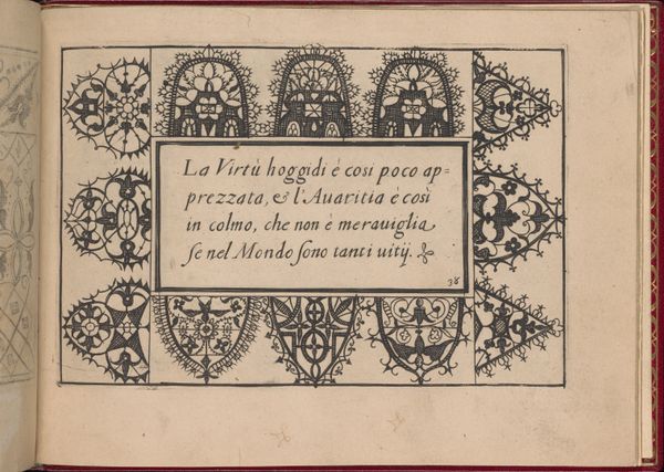 This is page 47 from Ghirlanda: Di sei vaghi fiori scielti da piu famosi Giardini d'Italia, made by Pietro Paulo Tozzi around the early 17th century. During this time, pattern books circulated widely, playing a crucial role in the transmission of design ideas across Europe. Within a rectangular frame, delicate floral and geometric patterns are arranged around an alphabet and a Latin phrase, "Non nobis Domine, non nobis, sed nomini tuo da gloriam," or "Not to us, Lord, not to us, but to your name give glory." This phrase, resonating with humility and devotion, encapsulates the era's complex relationship between artistic expression and religious conviction. Tozzi's arrangements maintain traditional forms of representation, yet subtly weave in alternative narratives. These pattern books served not only as sources of inspiration for artisans, but also as cultural artifacts that mirror the values and aesthetics of their time. They illuminate the convergence of art, devotion, and identity in early modern Italy.