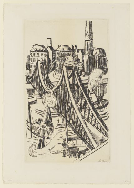 Curator: Up next we have Joseph Pennell's "London Bridge Stairs," an etching created in 1903 that offers a glimpse into London's bustling cityscape. What's your immediate take on this print? Editor: The immediate sensation is one of density. The artist has captured London's tangible history, brick by brick, echoing within. There’s a somber weight to it; the air seems heavy. Curator: It’s fascinating to consider the time. Pennell created this during a period of intense urban development and social change in London. The etching technique lends itself so well to documenting this grittiness. Editor: Etchings possess such inherent capacity for detail and nuanced symbol placement, don't they? I'm especially drawn to the way the water reflects the bridge, like a subconscious mirror of progress—and the small figures, hinting at larger collective dreams, a testament to London's perpetual narrative. Curator: Absolutely. Consider that the bridge wasn't just a means of transport. Bridges, historically, signify connection, points of access. Pennell, an American, likely felt that pull acutely, viewing London as both a familiar and foreign space. The viewpoint he has chosen showcases his relationship to this subject. Editor: A transitional zone indeed. One cannot forget the potent iconography of water and bridges! Water holds cleansing and transformative attributes in many cultures, as does the journey across a bridge which denotes passage from one state to another, whether actual or spiritual. The stairs provide access to this new world. Curator: I hadn't thought of it in terms of access and opportunity for many individuals, rather than as a singular crossing for societal segments. Editor: Precisely. And note the sharp contrast with the sky's pale tone and the structure's darker ink tonalities. It brings an emotional weight, setting this in the specific space, yet it stands representative for much more. Curator: A truly evocative rendering of London's intricate layering, seen both as a physical space and symbolic passage through societal transformation, doesn’t it? I have found a completely new view of the work because of your interpretation. Editor: And your understanding of the history of London itself provides me new lenses to envision this artwork, I may view this for years to come!