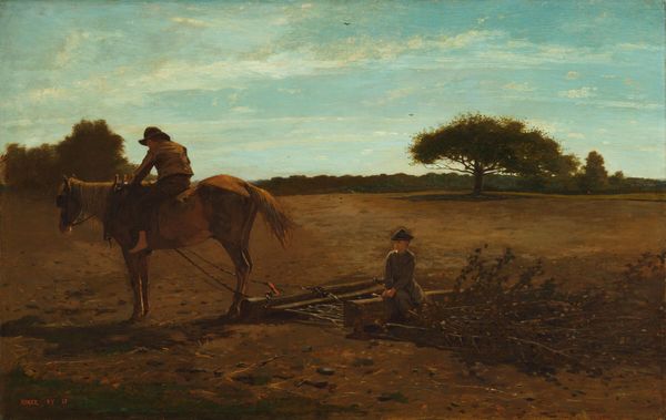 Curator: Here we have Wilhelm Marstrand's painting titled “Don Quixote’s First Ride Home.” Editor: Oof, talk about a walk of shame! The lighting gives it a real end-of-the-day, deflated-dreams vibe. Curator: Exactly! It captures a pivotal moment, likely from early in Cervantes' narrative. We see Quixote, slumped on his donkey, Rocinante limping behind with Sancho Panza, looking quite distraught and walking to their village. Editor: The donkey looks as enthusiastic as a Monday morning. And is that...pity I see in the horse's eye? Curator: (Chuckles) Perhaps. Marstrand, known for his genre painting, seems fascinated by the performative aspect of social roles. Look at the composition. Quixote is centered, but his slumped posture undermines any heroic presence. The setting itself, that lonely landscape, amplifies his isolation. Editor: Absolutely. And Sancho Panza... he's a whole mood. That expression, the slouch – pure comedic tragedy. He really sells the "well, that didn't go as planned" feeling, right? You almost feel bad for him. Curator: The beauty here is how Marstrand navigates this blend of humor and pathos. Quixote's idealism, juxtaposed against the harsh realities depicted through naturalism and through the attitudes of Sancho Panza in particular. These Romantic era tropes of individualism find counterpoint in the social realities. Editor: There's a sort of universal feeling about it all – the come-down after a big swing, the contrast of idealism versus reality, it rings very true. It transcends the specific narrative, doesn't it? Curator: It does. The painting engages us with themes of disillusionment, and the difficulty of reconciling ideals with reality—themes very present in Marstrand's time period and relevant today. Editor: Yeah. I came in thinking "historical painting," but I’m leaving with a feeling of...well, of shared human absurdity. Thanks, Don. Curator: Indeed. Marstrand invites us to find ourselves in Quixote's journey, in all its ridiculous glory.
