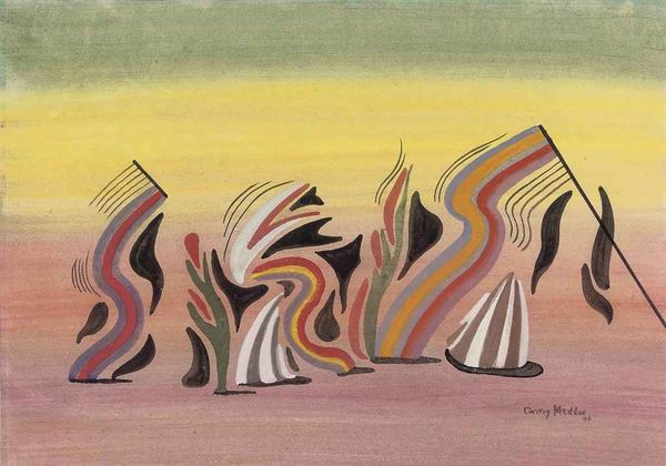 Editor: Here we have Kazimir Malevich's "Red Cavalry," an oil painting from 1932 now residing in the Russian Museum in Saint Petersburg. What strikes you first? Curator: The horizontal composition, most prominently, is partitioned into bands of color. It reads as landscape, albeit in a highly abstracted mode. The upper band is a gradation from a vibrant blue to a near white, suggestive of sky and horizon, with the geometric application of color blocks suggesting a ploughed landscape below. Editor: Right. My eye immediately goes to those thin, regimented red figures at the horizon line, they appear almost printed on. Considering the period in which it was created, and its theme, could the figures be stand-ins for the collectivization of labour? I'm also drawn to the way the landscape below the "Red Cavalry" itself resembles layers of compressed earth. Curator: Absolutely. And note how Malevich subtly plays with perspective and scale, creating a visual tension between the implied depth of the landscape and the flat application of paint, pushing and pulling the viewer's eye. The color selection also speaks volumes. The stark contrasts of red, black, and green—the layering in an almost stratified order– creates a sense of unease, reflecting, perhaps, the turmoil of the Soviet era. Editor: The materiality contributes heavily to that feeling of unease. I mean, those impasto ridges and visible brushstrokes almost suggest manual labour – the land brutally formed by people and tools. We might reflect upon Malevich's own complex relationship to the revolutionary era in Russian history, which both influenced and ultimately repressed many artists. Curator: Precisely. He returned, ultimately, from pure abstraction towards figuration during the early Stalinist period, thus "Red Cavalry," if seen in such a biographical light, can also be interpreted as a concession, a return to representation while still clinging to suprematist abstraction as an act of personal agency and creative resistance. Editor: This piece becomes ever richer with that reading. The painting embodies tensions on formal, historical, and even material levels. Thank you for those astute observations. Curator: Thank you. Considering all this, I will be giving it further thought, too.