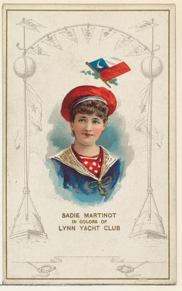 Curator: This captivating piece is titled "Lillian Grubb in the Colors of the Madison Yacht Club," part of the "Yacht Colors of the World" series, dating back to 1890. It was issued by W. Duke, Sons & Co. to promote their Honest Long Cut Tobacco. Editor: My first impression is one of delicate beauty. The soft colors and elegant composition create a feeling of serenity. I’m drawn to the symmetrical arrangement and the interplay of lines—verticals of the oars against the softer curves of the ropework frame. Curator: The symbolism certainly contributes to that serenity. Lillian, adorned in the yacht club's colors, embodies a sense of maritime pride. Flags are powerful signifiers, emblems carrying history and allegiance, aren't they? In this case, the club's colors signal belonging and shared identity. And in terms of cultural memory, it's interesting how such imagery evokes the allure of leisure and recreation during that era. Editor: Agreed. The frame is fascinating. It's not just decorative; the use of oars and nautical rope strongly emphasizes the yachting theme. The gold ink catches the light beautifully. Speaking of color, notice how the watercolor's muted tones emphasize Lillian’s soft features, and the red accents in her bow and hat-ribbon really pop? Curator: The artwork definitely taps into the cultural aesthetics of the time. The influence of Japonisme is subtle but present— a flattened perspective, a taste for decorative embellishments. And I agree that there is indeed a sense of idealized womanhood portrayed. She becomes an allegorical figure connected to the yacht club, an icon representing an entire social group. Editor: From a formal point of view, I'm intrigued by the surface. One can appreciate the textures— the smooth washes of the watercolor in her face, contrasted by the slightly rougher texture of the print itself. Curator: Indeed. These little cards functioned as a form of mass communication. This was advertising but also a glimpse into societal aspirations, gender roles, and even the expansion of leisure culture. Editor: Ultimately, both the artwork and the way it was intended to be used reveals so much more beyond its initial purpose. Curator: Yes. It's a reminder that even seemingly simple images hold complex narratives.