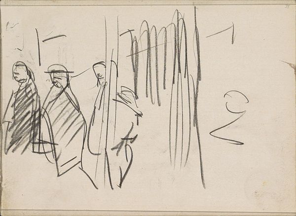 Curator: Before us we have Isaac Israels’ pencil drawing, “Mannen met hoeden,” or “Men with Hats," which he produced sometime between 1875 and 1934. Editor: My first thought? Nervous energy. It’s just scribbles, aggressive and searching. I wonder, was Israels frustrated? Curator: Well, let's not get ahead of ourselves. While seemingly rough, notice how Israels uses the direction and weight of his pencil strokes to suggest volume and shadow, the quick notations providing a collective sense of bustling movement. Do the hats suggest to you, perhaps, a certain…respectability, concealing an identity? Editor: Maybe, or it could be a question of material conditions. Pencil sketches are cheap and fast. For someone depicting modern life, this medium is perfect. Did he intend this as a final work, or as preparation? What social pressures was Israels responding to? Curator: We can't be certain about intent, can we? But consider the hat: historically, it signified social standing, profession. Here, rendered abstractly, are we seeing the deconstruction of such rigid social roles, the very act of concealing as a social commentary? The symbolism could run deep. Editor: I tend to agree; however, perhaps what is more subversive is its style of depiction. Forget about symbolic gestures. For Israels and others working around him, capturing something on paper immediately, that becomes their primary goal, their contribution. You might even say that it democratizes art-making and representation. Curator: Indeed, and perhaps these fragmented images speak volumes about the changing social fabric of his time. We look through a glass darkly and must discern patterns and underlying themes to reveal an understanding that otherwise hides within. Editor: Exactly! So, what initially appeared as mere sketches may have layers after all; though its creation tells of material necessity, pencil drawings could prove socially rich when considered together, don't you think?