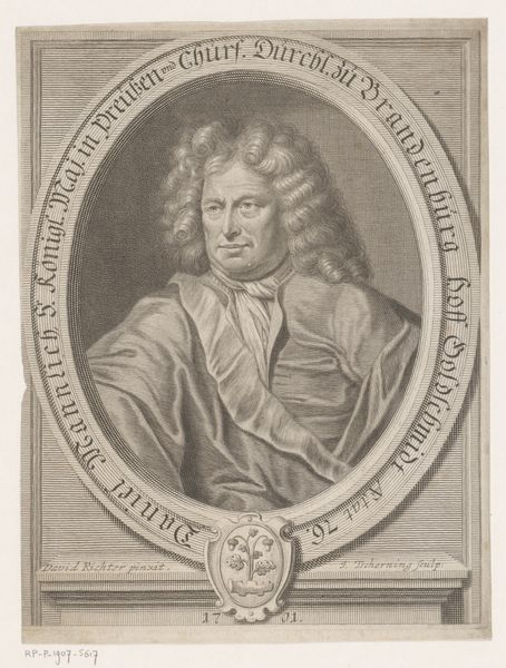Editor: Here we have Bartolommeo Follin’s "Portret van componist en luitspeler Sylvius Leopold Weiss," dating from around 1740 to 1808. It’s an engraving, giving it a very detailed and almost austere feel. I'm interested in how this print was made. What can you tell us about the production of this artwork? Curator: Well, consider the labor involved in creating an engraving. It’s an incredibly skilled process, demanding intense focus and meticulous handiwork. Someone meticulously etched the design into a metal plate, which was then used to reproduce identical images for circulation. That very act makes you think of the democratization of art facilitated by printmaking. Editor: So, you're saying this print is about more than just a portrait? Curator: Precisely. It is, fundamentally, about access and production. Prints like these were tools for disseminating images and knowledge to a broader public, outside of the elite who could commission paintings. This engraving isn't merely depicting a musician, it embodies a shift in how art was made and consumed, what role does the engraving process itself, the repeatable nature of it, play in the piece's social context? Editor: I guess I hadn't considered the engraving process in that way. I was focused on the image, the sitter and not how that image came to be and was shared. So the choice of print, as a medium, is vital. Curator: Exactly! And it allows us to rethink who art was *for*, and the materials of distribution that enabled it. Editor: That's a fascinating way to look at it. Thanks! Curator: My pleasure! It makes you appreciate the engraving for more than just its aesthetic value.