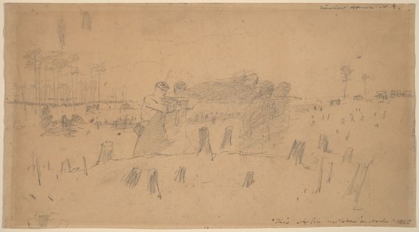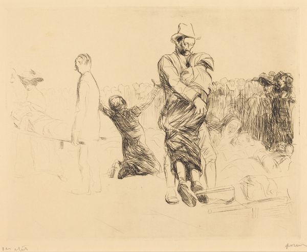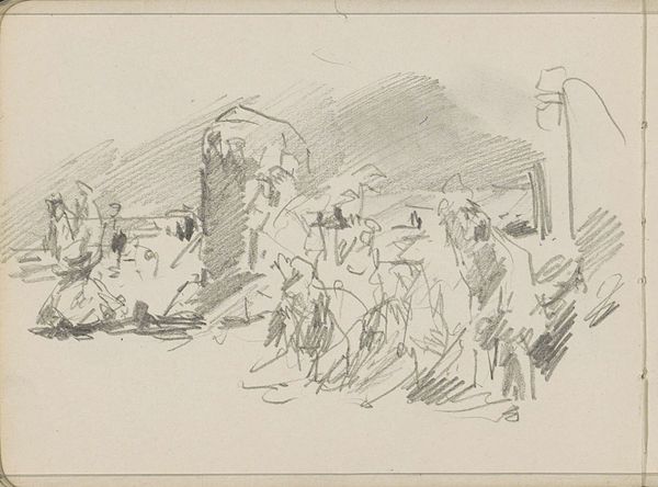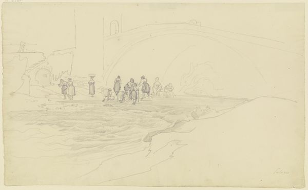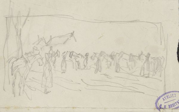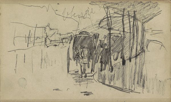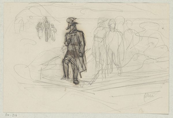 Editor: Here we have Jakob Nussbaum’s "Street in Laon," created in 1916 with pencil on paper. It's striking how economical the lines are, yet they convincingly convey a sense of place and human presence. What do you see in this piece that might elude a casual observer? Curator: The formal structure of this work commands immediate attention. Consider how the artist employs a limited tonal range, focusing instead on line and form. The composition is almost divided, with a discernible foreground and background, achieved through the varying pressure of the pencil strokes. The figures in the foreground are rendered with darker, more defined lines, drawing the eye. How does that initial placement influence your subsequent interpretation? Editor: I notice the figures leaning on the railing, gazing out. There is some narrative at play but the subjects of that narrative remain indistinct due to the simplicity of the representation. Curator: Indeed. Observe how the receding lines of the road create a visual pathway, inviting the viewer's eye to traverse the space. Note that the perspective is subtly skewed, destabilizing the expected order. Is this perhaps Nussbaum emphasizing the chaos and uncertainty inherent to this period in the 20th century, considering it was created during wartime? Editor: The subtle skew is intriguing! Focusing on form, it does add a layer of tension that might not be obvious at first glance, but impacts the work’s tone once observed. I am wondering if Expressionism and its core aspects play an essential role. Curator: Yes, let us consider Expressionism's engagement with internal psychological states manifested outwardly. However, my claim would focus on how Nussbaum uses the visual language—line, form, composition—to suggest the emotional climate. That, after all, is where the expressive potential resides. The artwork here, as pure structure, stands alone in its effectiveness and impact. Editor: I appreciate how you’ve highlighted the formal elements as primary drivers of meaning, revealing a depth I initially missed. Thank you. Curator: My pleasure. It underscores how formal analysis enriches our comprehension, irrespective of historical or cultural contexts.