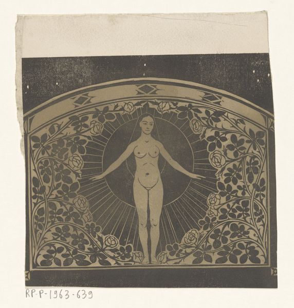 Here is your audio guide entry: Henri van der Stok created this monochromatic woodcut, "Sterrenbeeld Weegschaal," whose stark contrasts immediately draw the eye. The composition is dominated by a central, stylized female figure representing Libra, the scales of justice suspended on either side. The limited palette enhances the symbolic weight of the image, inviting us to consider the underlying structures of representation. Van der Stok employs a semiotic system where each element functions as a sign. The figure, rendered in pale relief against the dark background, is framed by geometric and organic motifs. This juxtaposition suggests a tension between rationality and nature, a dichotomy inherent in the astrological sign itself. Notice how the scales are not merely balanced; they are integral to the figure's pose, linked at her heart, symbolizing Libra's pursuit of equilibrium. The artist’s use of positive and negative space creates a dynamic interplay that challenges fixed meanings. Rather than a straightforward depiction, the woodcut destabilizes traditional representations of justice, embedding it within a matrix of cosmic and earthly symbols. The emphasis on form and structure encourages us to interpret the artwork as a complex interplay of visual and cultural codes, open to ongoing interpretation.