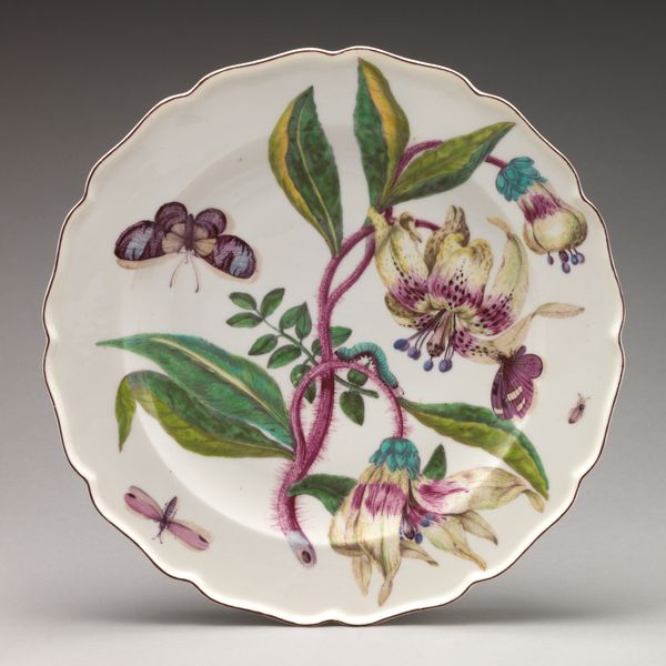 Curator: So, we’re looking at a ceramic plaque here at the Metropolitan Museum of Art, made around 1720 to 1730. The floral design really stands out on the clean porcelain. Editor: Ah, it has an optimistic delicacy to it. Feels very… powdered-wig. Am I way off? Curator: Not at all. You're sensing the Rococo influence. See the asymmetry and playful detail in those blossoms and leaves? They practically dance. Editor: Exactly! Those looping stems holding clusters of painted flowers—they evoke festivity, definitely hinting at celebrations. Porcelain suggests an intimacy too, it wants you close, it holds some luxury, doesn't it? Curator: Yes. The whiteness, and those restrained pastel colours give it such elegance. The floral designs draw from Chinese motifs that were popular during this time. Remember, this kind of ceramic work was highly prized, emulating Asian imports, but very much with a European flair. Editor: Of course! And this object is so overtly pretty. Beyond the simple flower subjects—roses, perhaps peach blossom?, it represents a cultured appreciation of the beauty of nature; there's an innocent sophistication that is pleasing and fascinating all at once. This sort of floral style and subject communicates good taste and a sense of refined abundance to a past audience. It could well represent wealth. Curator: I think so. And while simple at first glance, there's some interesting texture in how those colours were applied. Lightness too, in those translucent areas. Each one seems a study in careful representation of form. The overall presentation, contained within this circular plaque, almost begs you to touch it, feel its cool perfection. Editor: Makes me want to commission my own! The idea of freezing fleeting blooms in time through painted ceramic has an emotional charge that will live long beyond their actual life. There’s an undeniable power in symbols to transcend generations. It almost feels… archetypal. Curator: In a sense, it truly is. The past made tangible. Editor: Well, I think I shall look at porcelain with fresh eyes for quite some time.