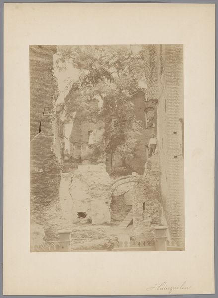 This silver gelatin print captures a section of the Batenburg castle ruins, and was made by an anonymous photographer working for Monumentenzorg, likely in the early 20th century. Monumentenzorg, or the Dutch National Service for the Protection of Monuments, was charged with preserving and documenting historical sites. Looking at the image, we see the stark reality of time's passage reflected in the crumbling brickwork and the moat that surrounds what's left. The image creates meaning through its direct and unromanticized depiction. This photograph might have served a dual purpose: as a record for historical preservation and as a statement on national identity. The very act of documenting and preserving these ruins speaks to a desire to connect with the past, and to negotiate the role of history in shaping contemporary Dutch society. Understanding this image requires delving into the archives of Monumentenzorg, examining the policies and cultural values that shaped their mission. By doing so, we can better understand the complex relationship between art, history, and the institutions that mediate our understanding of the past.