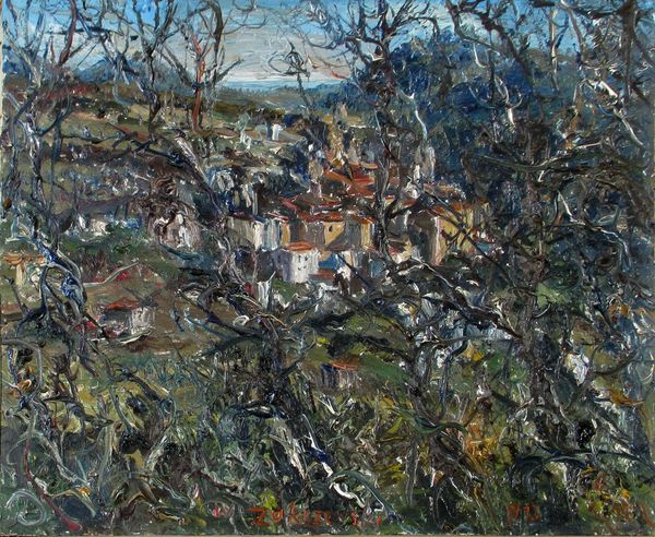 Editor: This is "Tapping Rhythm’s Tone" by Wang Xinfu, created in 2017 using acrylic paint. I’m struck by how densely textured it is—it feels like I could almost reach out and touch every stroke. What do you make of it? Curator: The impasto application of paint certainly commands attention. Note the interplay between light and shadow created by the three-dimensionality of the pigment. How does this materiality affect your reading of the overall composition? Editor: It makes me feel a little lost, to be honest. It’s almost overwhelming to look at because there aren't very many smooth surfaces where my eyes can rest. Curator: Precisely. The lack of planar resolution encourages a phenomenological reading. Forget the 'what' and feel the 'how'. Consider the relationship between color and form; areas of muted gray-brown yield to unexpected bursts of teal and rose, generating a compositional tension. The artist’s method seems almost sculptural in its manipulation of paint. How do you see these separate components building a greater experience? Editor: So it’s less about identifying specific objects and more about experiencing the push and pull of the different colors and textures against each other? Almost like the artist is conducting the tempo? Curator: Indeed. Disregard representational space and concentrate instead on the formal dynamism. What happens when you focus solely on the interplay of textures? Do any particular lines or masses feel dominant? Editor: That’s a really interesting way of putting it! Now, looking at the relationships between colors rather than trying to decode them opens this artwork up. Curator: Exactly. By analyzing formal components rather than representational value, we move closer to understanding the intrinsic qualities within "Tapping Rhythm’s Tone".