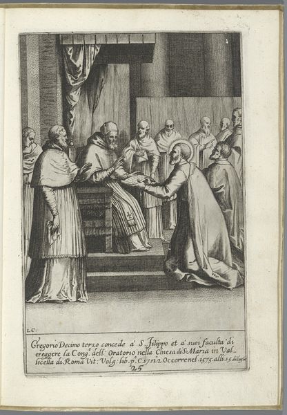 Curator: Here we have Willem van Swanenburg’s 1610 engraving, "Thomas van Aquino bij een beenoperatie," which translates to "Thomas Aquinas at a leg operation." It resides in the Rijksmuseum collection and is a particularly striking example of Dutch Golden Age printmaking. Editor: Oh my. The first thing that strikes me is the, shall we say, lack of anesthetic. It feels intensely voyeuristic, almost like witnessing something sacred being violated. There's this stark contrast between the patient's apparent serenity and the focused, almost brutal activity surrounding him. Curator: Absolutely. The print captures a pivotal, if rather gruesome, moment in Aquinas’s life. Historical accounts suggest that he underwent this procedure, likely a cauterization, to alleviate pain, possibly from a boil or some other affliction. It is interesting to see how a medical procedure transforms into almost a holy moment. Editor: The figures gathered around the scene are captivating, aren’t they? The one holding the branding iron with such focused intensity and those onlookers—a mix of concern, curiosity, maybe even a touch of morbid fascination. Their expressions are so delicately rendered in this tight composition. It’s like a theatre of emotion. Curator: Indeed. Van Swanenburg really excels at conveying the psychological depth of his subjects through subtle gestures and facial expressions. It reflects a baroque sensibility in its dramatic presentation and intense emotionalism, though contained within the detailed linework characteristic of the Dutch Golden Age. Think about how engravings served as a means to disseminate knowledge, philosophical ideas, and hagiographies like this one to a wider public. Editor: It’s interesting to consider this within that framework of disseminating knowledge. This isn't just about recording a medical procedure, it seems more about conveying an ideal – almost like the saint's mind transcends the body and the material world completely during times of physical stress, highlighting his unwavering faith and inner strength. The pain barely registers. Curator: Exactly. The engraving transforms a personal medical crisis into a public demonstration of piety and spiritual fortitude. Editor: It is somewhat grim but there is also some artistry here. I like it. A snapshot of bodily intervention. Curator: An intervention with historical resonance, that’s for certain!