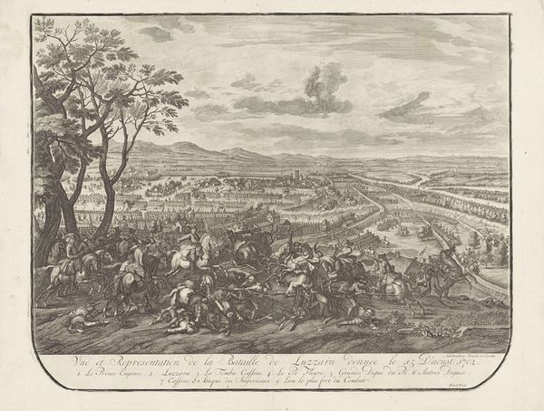 Editor: This is Jacques Rigaud's "View of Meudon Palace and Village," a print made with etching on paper, sometime between 1730 and 1740. I'm immediately struck by the sheer labor involved in creating this detailed landscape using such painstaking techniques. It gives a glimpse into a specific time and place. How do you interpret this work? Curator: Considering it materialistically, the etching process itself is key. Think of the physical effort—the crafting of the plate, the controlled corrosion by acid. This wasn't just about depicting a scene; it was about a deliberate process of reproduction, making the image accessible to a wider audience. The paper itself becomes a crucial element—its quality, its source—linking the artwork to networks of trade and consumption. How does the existence of such reproduction alter the meaning of the landscape? Editor: So, it's not just about the view of the Palace, but also the means by which that view was made available? Curator: Precisely. It forces us to question the hierarchy. Is the 'high art' of landscape painting inherently more valuable than the 'craft' of printmaking? By focusing on the labor and materials, we can see how this print blurs those lines, revealing the complex social and economic forces at play. Think of the cost involved, and who had access to prints like these. It's an early form of mass media, influencing perceptions of place and power. The materiality reveals access! Editor: That's a very different way of seeing it! I was focused on the landscape itself, but you've shown how the process of creating and distributing this image changes how we should think about its value. Curator: And isn’t it fascinating how a seemingly simple print reveals layers of material history and social context?