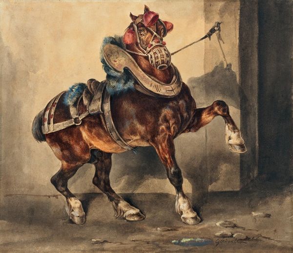 Curator: Théodore Géricault’s "The White Horse Tavern," housed here at the Harvard Art Museums, presents a seemingly simple scene. Editor: The composition, though, has this strange diagonal pull, almost as if the scene might tip forward. Curator: It’s the liminal space of transition, literally a stopover. Horses, since antiquity, have symbolized power, virility, and even freedom. The weary rider and the two horses signify the toils of journeys. Editor: The painting’s materiality strikes me too. Notice the thick impasto in the horses’ coats versus the thinner washes in the cloudy sky. Curator: Indeed, Géricault's brushwork intensifies the drama, mirroring the social tensions of post-Napoleonic France, I think. A society in flux. Editor: I see it as a study in contrasts, a moment captured using light and shadow. The artist definitely had a gift for texture.