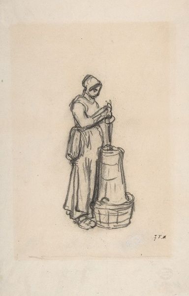 Jean-François Millet made this sketch, "Study for Woman Churning Butter," using black crayon to create the image. Millet lived through the 1848 Revolution in France, a time of upheaval and calls for social reform. This sketch gives us insight into the lives of rural women, who were often overlooked in the art world. Millet seemed interested in the realities of peasant life, capturing a scene of everyday labor. The woman is depicted mid-churn, her body language suggesting the physical exertion required to make butter by hand. A cat sits patiently by her feet, a small companion in her domestic sphere. While Millet's work has been praised for its realism, we can also see it as part of a broader cultural interest in idealizing rural life. It raises questions about how artists represent labor, gender, and class. We can also consider how our own perspectives shape the way we view this intimate scene.