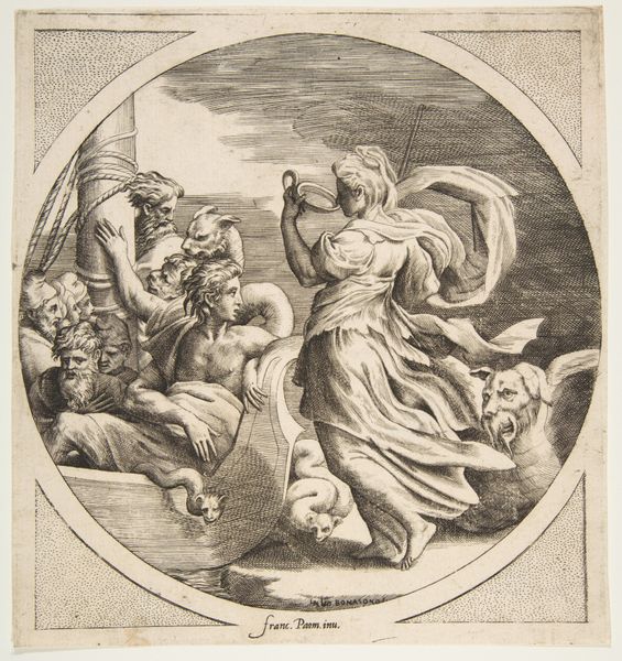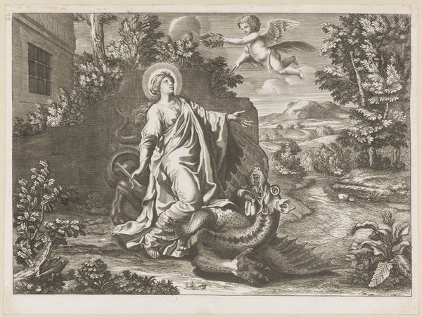 Curator: Here we have "The Assumption of the Virgin, who is seated in the clouds with arms outstretched, angels surrounding her," an engraving by Fra Antonio Lorenzini, dating from 1685 to 1720. Editor: The composition feels... overwhelmingly baroque. All this swirling cloud cover and an oddly frontal presentation of the Virgin. What's your take on this print’s design? Curator: Well, look closely at the interplay between light and shadow. The Virgin’s robes, for instance—see how Lorenzini uses fine lines to create a sense of volume and drapery? The formal dynamism draws the eye upward, emphasizing her divine ascent. Editor: And contextually, engravings such as this, and others by Lorenzini, had significance during the Counter-Reformation, serving as propaganda distributed widely. Consider the cultural and political landscape – art as a tool. It provided readily available imagery and solidified the church position. Curator: An intriguing insight into the societal role of religious iconography. From my perspective, this is also about form. The artist emphasizes idealized proportions to highlight her heavenly perfection. Her pose—arms open—a powerful symbol of grace and welcoming acceptance. Editor: Of course. And let's not overlook the dedicatee "All Ill Sig e Prona mia Coll. La Sig Co. Cortanza." The dedicatee, Iolani Germi Dama. That speaks to the circles of patronage. I wonder how its distribution and impact would differ today. Curator: Returning to a focus on the artwork’s execution, note how the engraver captures a variety of textures - from the Virgin's skin to the feathery softness of clouds using distinct engraving techniques. The density of lines creates depth and complexity. Editor: Indeed. But without understanding the power structures it reflects, we can only see the image, not the forces that produced and used it. A beautiful relic and telling symbol. Curator: Agreed, seeing the print as an historical artifact enhances my appreciation for Lorenzini's artistry, merging intention and outcome into a comprehensive view. Editor: An appropriate synthesis that combines image and historical context in considering such devotional artworks.
