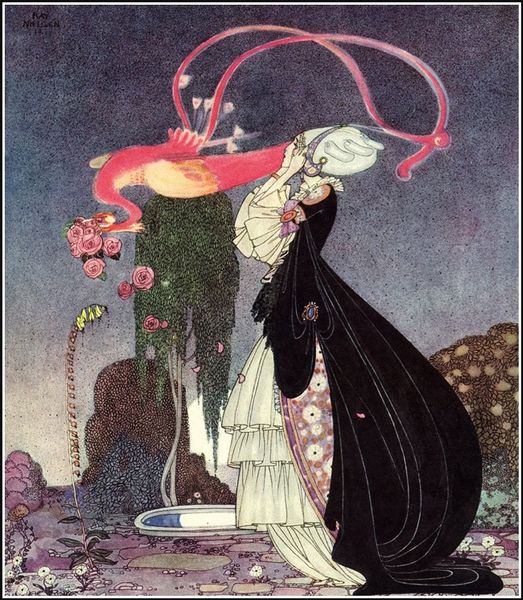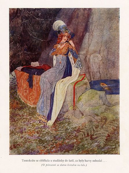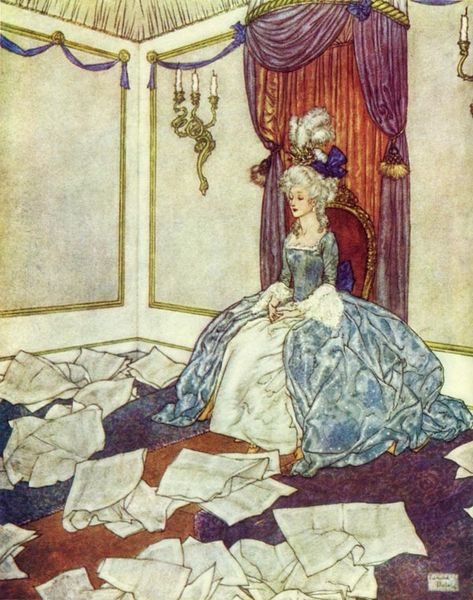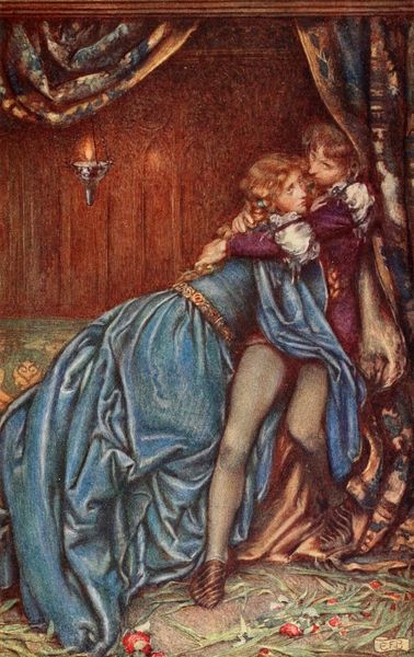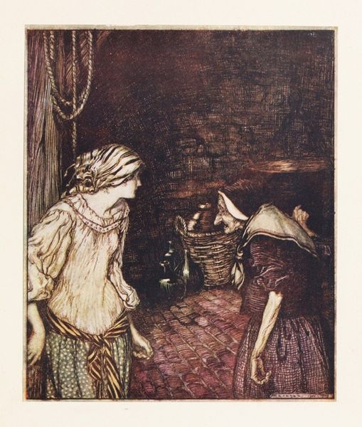 Editor: This tempera painting, "Illustration for The Nutcracker and the Mouse King," was completed in 1924 by Artuš Scheiner. It has a dreamy quality that's both charming and a little unsettling. What can you tell me about this work? Curator: The power of illustrations, especially those depicting fairy tales, resides in their ability to tap into archetypes. Here, we see a girl, caught in the liminal space between childhood and adulthood, encountering a toy soldier that appears very lifelike. What does the soldier represent to her? Editor: Maybe hope? The potential for adventure or maybe even a kind of… protection? I guess fairy tales can have dark elements too. Curator: Exactly! Observe how the artist uses light and shadow. The single candle flame throws dramatic shadows, but does it banish the darkness or amplify the mystery? Also, notice how the palette is mostly cool tones. Do these blues and greens evoke safety or something else? Editor: It's strange. It’s like the warmth of the candle highlights the coldness of the rest of the room. The colors make it less of a happy story, I think. More serious? Curator: Precisely. This juxtaposition is common in Romanticism. It seems the painting acknowledges both the allure and the potential dangers inherent in fairy tales and growing up. They represent the power and dangers of liminal spaces and transformation. Does that add new meaning? Editor: Yes, definitely! I thought it was a simple children's illustration, but there are all these undercurrents! I see it differently now. Curator: Me too! I learn so much with our conversations. Thank you!