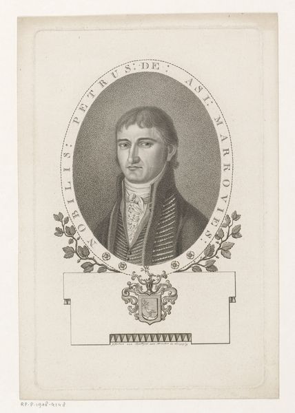 Curator: Let’s turn our attention to this portrait drawing. Duval, as he signed himself, created this portrait of André Dupin in 1826. The piece, rendered in graphite, is currently housed right here at the Rijksmuseum. Editor: It has an austere elegance, doesn’t it? The tight control of line, the careful shading... you almost feel like you can reach out and touch the man’s severe jacket. I’m curious about Duval’s use of graphite for such a formal portrait. Curator: Indeed. Consider the rise of graphite as a readily available, relatively inexpensive material in the 19th century. It democratized portraiture to some extent. This allowed artists to produce multiples easily or to create preparatory sketches. Editor: So, a tension arises. The material suggests accessibility, but the artistic style, very much within the Neoclassical tradition, lends itself to a more elevated representation. Dupin himself, as a prominent lawyer and later a politician, likely had specific expectations for his public image. How do you think the frame around the figure contributed to that public role? Curator: The frame certainly adds another layer of meaning. It's filled with symbolic motifs, referencing classical art and suggesting Dupin’s connection to those ideals. Notice the laurel wreaths and classical figures. It elevates the sitter by associating him with enduring virtues and intellectual prowess. The visual cues suggest Dupin saw himself as a defender of justice and upholder of classical values in the social and political sphere. Editor: I agree. Looking closely at the frame itself, the precise lines of those decorative elements seem almost mass-produced in contrast to the more freely rendered face. Was the frame a pre-existing element or specially designed and printed? Curator: Interesting question. The level of detail in the portrait suggests a unique execution; whereas, the surrounding decorative frame appears almost printed or mechanically reproduced. Editor: Duval and his printmaker played clever with medium and mode of presentation to capture this lawyer, Dupin, at a specific cultural moment. Curator: An excellent point, Duval's artwork showcases that material choices and context intertwine in fascinating ways. Editor: Agreed! I think I will come away thinking about all the things beyond the obvious regarding art production and appreciation.