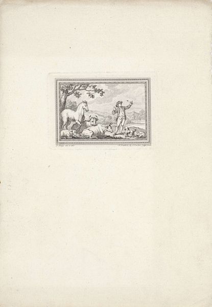 Curator: Looking at "Paard en wolf," or "Horse and Wolf," an engraving by Reinier Vinkeles dating back to 1792, currently residing here at the Rijksmuseum. Editor: It has a stark quality, doesn't it? The horse is mid-leap, away from what looks like a very insistent wolf. Almost comical in its melodrama. And all confined within that tight, neat frame, which emphasizes the raw texture. Curator: Indeed. The engraving, done with considerable skill, employs neoclassicist aesthetics within a relatively constrained space. But within that seemingly simple landscape setting, the symbolism feels potent. Editor: Well, the physicality is interesting to consider. Think of the labor intensive process of producing this print, cutting the image into a metal plate, one painstaking line at a time, multiple impressions struck, each one a repetition and an echo of the artist's initial gesture. The artist relies on a specialized skill. It is reproductive and distributive; but simultaneously labor-intensive. Curator: Precisely! And the choice of subject echoes certain familiar social anxieties. The horse, a creature of power and grace, is threatened by the wolf, representing wildness and the potential disruption of order. This contrast was a frequent theme in genre painting in the 18th century. Editor: Yet that landscape is so subtly rendered; so peaceful otherwise. Do you think there's a suggestion here about humankind's fraught relationship with the wild? Maybe we need that persistent challenge? Curator: I think that the contrast, the constant pull, it all depends on your own historical framework, even now! Whether you align the symbols towards safety or freedom, the narrative stays ambiguous. Editor: A fascinating piece of accessible art, then; full of meaning and a clear demonstration of skilled workmanship, even in miniature. Curator: Exactly! This print gives a glimpse of the world framed through an old, potent allegory; which speaks volumes despite its economical presentation.