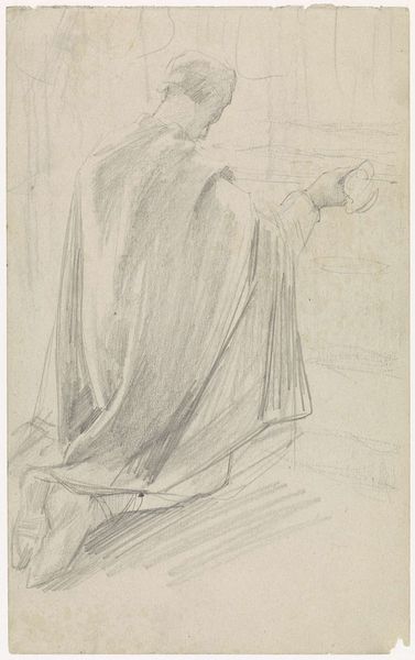 Editor: So, this pencil drawing, "Studie til 'Brevskriveren og Pigen'" – or "Study for 'The Letter Writer and the Girl'" – is by Ernst Meyer, dating sometime between 1797 and 1827. There's an unfinished quality about it, like a fleeting observation. What do you see in this piece, especially in its relationship to that cultural moment? Curator: Well, immediately, the emphasis on the act of writing resonates. It's not just about communication; the letter itself becomes a potent symbol. Consider the rise of literacy in that era, and how a letter signified connection, intimacy, power, even. It carries a great emotional weight, wouldn’t you agree? Editor: Absolutely. The act of writing then wasn't as commonplace as it is now, adding another layer of importance to the whole scene. Does the style reflect any particular artistic values or trends? Curator: Definitely. It aligns with academic art. The figures are rendered with a careful, almost classical restraint, despite the sketch-like quality. The unfinished state perhaps invites us to project our own feelings onto the characters and the unfolding narrative. Think about the visual weight carried by something like that wide-brimmed hat on the figure writing…What does that sartorial choice communicate, beyond its simple existence? Editor: It might signal status, even gender. It could be shading the writer's face from direct light for better visibility too, practical and symbolic combined, maybe? Curator: Precisely. These aren't just lines on paper; they're echoes of societal norms and personal stories waiting to be told. Each element accumulates into something that captures broader concepts than what one sees on first inspection. Editor: That’s a new perspective, seeing those connections between seemingly mundane elements and the larger social narrative. I'll definitely look closer at these details moving forward! Curator: Excellent! The true beauty is often found in the nuances of these historical remnants, a fascinating journey.
