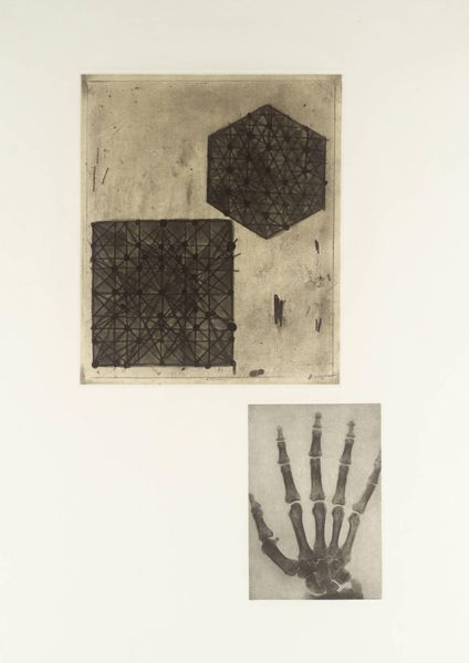 Curator: Terry Winters created this untitled print, held in the Tate collection. It’s a study in contrasts, featuring two distinct images. Editor: My first thought is that there's an intriguing sense of fragmentation here. The rough texture of the orb against the skeletal foot—it suggests a breakdown of wholeness, a kind of deconstruction. Curator: Winters often explores scientific and organic forms, blending abstraction with representation. The orb, densely patterned, recalls cellular structures or geological formations. Editor: Indeed. The composition, with its stark monochrome and isolated forms, emphasizes the inherent materiality of the print itself. It's as though we're invited to dissect not just the images, but the medium itself. Curator: It makes you wonder about the relationship Winters intended between the sphere and the foot. Is it about grounding, about the earth and our connection to it? Or something else entirely? Editor: Perhaps it's about mortality. The foot, so clearly skeletal, reminds us of our physical limits, while the orb hints at the vast, unknowable universe beyond. Ultimately, the artist gives space to contemplation. Curator: An open-ended conversation indeed.