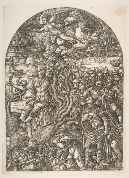 Jean Duvet created this engraving, The Angel Sounding the Sixth Trumpet, during the 16th century, a time marked by significant religious and social upheaval. Duvet lived through the Protestant Reformation, influencing both the subject matter and the emotional intensity of his work. Here, Duvet visualizes a scene from the Book of Revelation, filled with angels, demons, and suffering humanity. Notice how Duvet departs from traditional representations of angels, depicting them as muscular figures actively engaged in battle. The image is densely packed, creating a sense of chaos and violence, as bodies pile upon bodies. This intense imagery reflects the anxieties of a society grappling with religious conflict and the fear of divine retribution. Duvet’s detailed rendering invites you to reflect on the relationship between faith, power, and the human condition. The artist captures a sense of impending doom, reflecting the complex tapestry of faith and fear during the Reformation.
