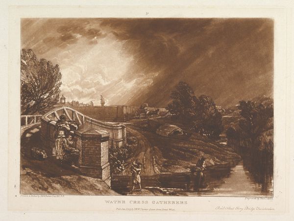 This is "Water Mill," a print made by J.M.W. Turner as part of his “Liber Studiorum” series. Turner used etching and mezzotint, processes rooted in craft, to capture his vision. The monochromatic aesthetic, achieved through careful manipulation of light and shadow, evokes a sense of nostalgia. Look closely and you can observe the texture and form of the water mill, the workers and animals, and the surrounding landscape. These details were created by using metal plates and acids to selectively carve lines into them, then applying ink to these lines and transferring them to paper. The labor-intensive process reflects the value of craftsmanship and challenges traditional distinctions between fine art and craft. The print reflects a society undergoing industrial change, where rural life and labor are increasingly viewed through a nostalgic lens. Appreciating the materials, the making, and the historical context enriches our understanding and deepens our connection with this image.