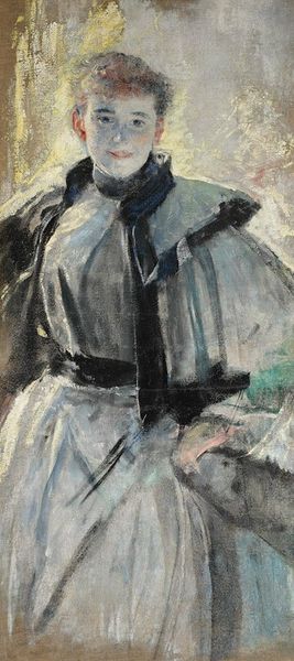 Curator: Welcome. We are standing before Sir John Everett Millais’ painting "Charlie is my Darling." It is rendered in oil paint with attention to light and texture, and exemplifies the portrait style. Editor: The figure’s somber expression is so evocative, despite the details blurring together a bit! Her stance seems both composed and hesitant. Curator: Indeed. Note the strategic use of chiaroscuro in modeling her face. This Romantic painting certainly leans into the sentimental and emotional. The bright skin stands out, illuminated against the shadowed surroundings and darker garment. Editor: I can't help but read this portrait as laden with symbolism. The very title points towards a specific 'Charlie,' suggesting a romantic interest or perhaps a familial connection with political overtones, possibly alluding to Bonnie Prince Charlie and Jacobite sympathies. Curator: Fascinating, and that informs your understanding of her pose? Her clothing definitely denotes high status and formality. I am interested in how her accessories—the hat, the riding crop—contribute to the overall composition. Editor: Precisely! The riding crop isn’t just a prop. The very action of clasping that crop could indicate readiness and a spirit of action! Curator: Agreed. There is that suggestion of the 'outdoor' or country pursuits, as distinct from the formal studio portrait setting, with the suggestion of landscape as texture. Editor: The Romantic style combined with those specific iconographic symbols…Millais' composition isn’t just pretty; it is narrative. Curator: It seems fair to propose this is a statement piece. A psychological portrait masked as a style. Editor: Very much so. I'm compelled to dive deeper into the historical context surrounding 'Charlie' and Millais himself to unpack all that it might hold. Curator: And from a purely formal perspective, considering its compositional elements provides such compelling insight too.