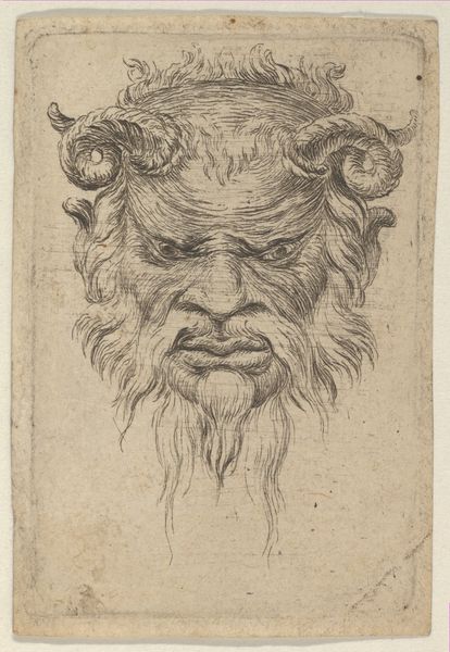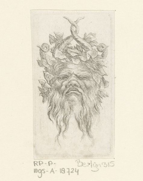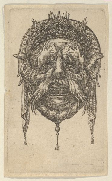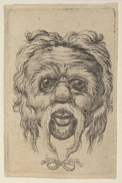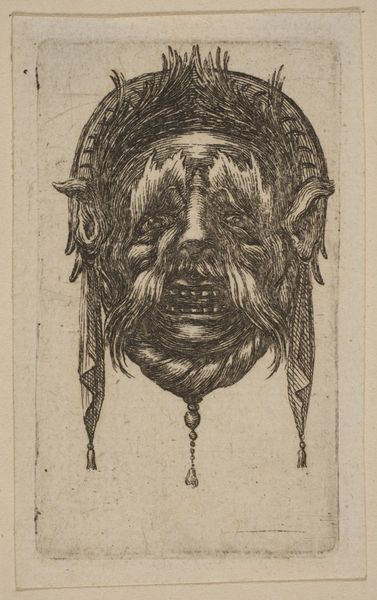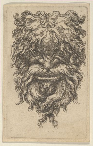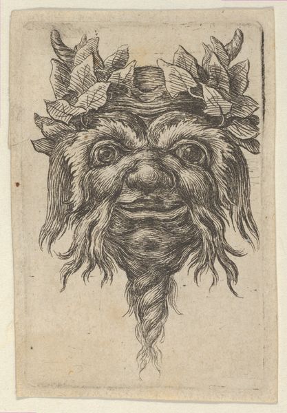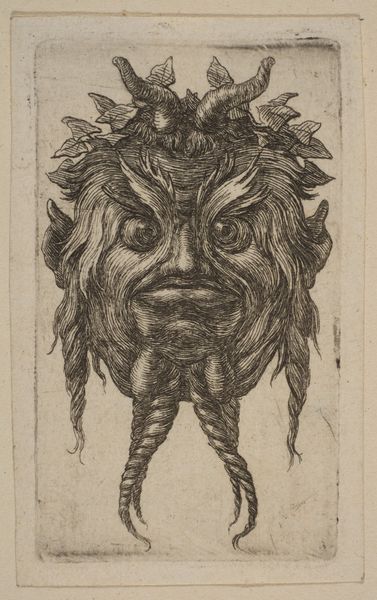 Editor: This intriguing etching, simply titled "Mask," was created by Stefano della Bella sometime between 1610 and 1664. It's housed at the Metropolitan Museum of Art, and it presents this rather imposing, foliate face. What strikes me is how… artisanal it feels, especially considering its age. How would you interpret this work? Curator: Focusing on the material, the etching process itself becomes paramount. Think about the labour involved: the artist meticulously carving lines into a metal plate. This wasn’t mere reproduction, but a craft demanding specialized skill, linking it to artisanal traditions. How did the social status of printmakers in della Bella's time impact his artistic choices? Editor: So you're saying the means of production actually influenced the style and subject matter? Curator: Precisely. Etchings were often more accessible and affordable, and therefore this “mask” motif might indicate catering to a specific market perhaps interested in theatre or pageantry. Note the recurring foliate patterns – consider the consumption of botanical imagery in Baroque society. Did botanical illustration drive, or was it driven by, broader societal fascinations? Editor: That's fascinating. It pushes me to see the connections between art production and market demand in new ways. Curator: By investigating the materials, methods, and the potential consumer base of della Bella’s work, we uncover layered histories of making and meaning. Consider too the circulation of these prints; what systems allowed these masks to travel, to impact design? These networks all feed into understanding art's cultural relevance. Editor: I never thought of approaching art from the perspective of production and consumption. Curator: Exactly. Recognizing art as an outcome of particular processes, resources and economic conditions provides significant insight. Editor: This really shows that there is so much more behind one image! Thank you.