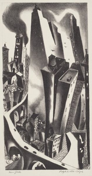 Curator: This is Eleanor Coen's "Skyline," a cityscape created around 1939 using charcoal and pencil. What are your initial impressions? Editor: There's an undeniable starkness, almost unsettling. The high contrast, the textures—it feels industrial and worn. Curator: Absolutely. Coen, as part of the Ashcan School, was invested in portraying urban life as it truly was, revealing social realities often ignored in mainstream art. Note how the "skyline" is composed not of glorious skyscrapers, but the backs of buildings and rooftops. What might that suggest about representation? Editor: Well, the material realities are laid bare, right? This isn’t some idealized vista. You see the grit, the close quarters. It emphasizes the everyday, the mundane elements of the built environment and how people are crowded in by it. The work in terms of labor is implicit, the energy it takes to extract from materials this representation is telling. Curator: Precisely! The elevated viewpoint denies the viewer a position of power, making us level with or even beneath the architecture, as if lost in the urban fabric. This raises critical questions about who gets to control space, whose perspectives are valued, and who is left behind. Editor: And look at how she handles charcoal. The smudging, the rough lines. It emphasizes the materiality of the drawing itself. The industrial feeling of the work is compounded in her technique. Curator: A keen observation. I also wonder if we should consider gender in our understanding. Coen, as a woman artist navigating a male-dominated art world, often explored overlooked subjects, creating spaces of visibility for the marginalized. Editor: That rings true. You see a sense of precarity here too, the constant change in those cities. Construction materials constantly consumed and reworked. It really underlines themes of the social alienation felt at that period. Curator: Exactly. "Skyline" is more than just a cityscape; it's a layered commentary on urban existence, material realities, and social power structures. Editor: I find the way Coen embraced that sense of urban anonymity. A statement to how the machine can work its material. Curator: An important addition! Thank you.