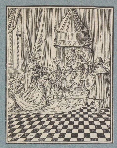 Christoffel van Sichem II created this woodcut titled 'David Anointed by Samuel’. The scene is set indoors and rendered almost entirely in black and white. The composition is built around stark lines and contrasting light and dark patterns. The eye is immediately drawn to the checkerboard floor, a grid that destabilizes our sense of depth and perspective. The room is filled with figures, yet the stark lines give each a distinct form. Van Sichem uses hatching to suggest depth and shadow, building a complex visual architecture. Note how the lines create both pattern and form, a subtle but powerful manipulation of visual space. The piece reflects the symbolic frameworks typical of the time. The woodcut's stark contrast and geometric underpinnings serve not only an aesthetic function but also reinforce the complex cultural and philosophical ideas about divine right. The composition invites us to consider how such forms can challenge fixed meanings, engaging with new ways of thinking about power and representation.
