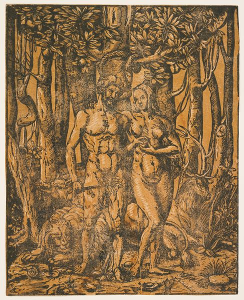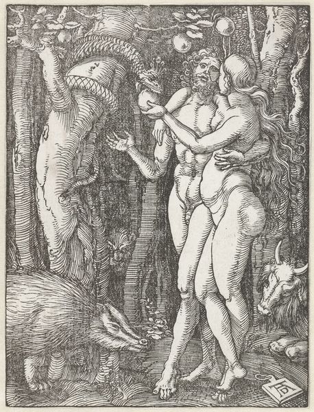 Here we see an engraved copy of "The Little Passion", created by Albrecht Durer in the early 16th century. The composition is densely packed, with figures of Adam and Eve surrounded by a dark, ominous forest. The texture is rich, achieved through fine, detailed lines that define forms and create shadow. The focal point is the moment of temptation, with Eve receiving the apple from Adam, offered by the serpent coiled around a tree. Durer uses a structured approach here to explore the theme of original sin. The characters are placed within a semiotic landscape – the forest, with its lurking creatures, functions as a signifier of danger and the loss of innocence. Through his calculated use of line and form, Durer invites us to consider not just the biblical narrative, but its broader implications for human nature and moral understanding, challenging viewers to reflect on the nature of choice and its consequences.
