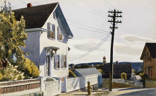 Curator: Let’s spend some time discussing Billy Morrow Jackson's oil painting from 1967, titled "Eve". It’s a striking depiction of a house, overlaid with themes of American identity and domestic life. What stands out to you initially? Editor: There's a distinct moodiness, a somber atmosphere that pervades the scene. The muted color palette, predominantly grays and whites, adds to the sense of stillness, even melancholy. The scale of the house is imposing. Curator: Absolutely. The stark realism is typical of Regionalism; however, what fascinates me is how Jackson connects it with a broader social commentary. Think about the materiality itself: the weathered wood of the house, the aged paint, how that echoes the state of the nation in the late '60s. What does it mean to present the flag on a dilapidated structure like this? Editor: Visually, it's a juxtaposition that creates tension. The flag, with its bright red and white stripes, offers the only real contrast to the otherwise monochromatic setting. It’s visually symbolic against the architectural backdrop that's fading; there is a striking tension of texture against symbolic subject. The surface is almost a topographical study, isn’t it? Curator: Precisely! The textures, rendered with oil paint, almost narrate the socioeconomic conditions and post-war changes that small towns experienced. The worn facade, plus Jackson's careful choice of subject: a weathered American home, are far more than decorative choices. Think about who is represented in landscape painting from the time period: the painting captures shifting national paradigms and regional anxieties about industrialization. Editor: The window framing looks almost like stagecraft – yet it grounds itself in stark realism. It captures the ordinary in an elegant way. And there’s that lone figure sitting on the porch—adds to the contemplative, almost haunting atmosphere. The flag becomes not a triumphant symbol, but perhaps a complicated, and weary, commentary on a specific point in US history. Curator: Yes, and through the formal composition – color, shape and texture, we’re drawn to understand it better, beyond any simplistic notion of "Americana." Jackson uses art to comment on American identity as something complicated. Editor: It definitely feels more complex than a celebration. More like a questioning—of values, of ideals, mirrored in that aged façade. Curator: Indeed. Jackson forces us to reconcile iconic symbolism with the material realities that underpinned everyday life. Editor: So even through formal analysis, there is so much social commentary. Thanks for unpacking that!