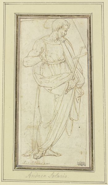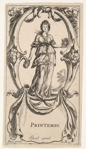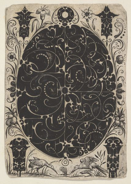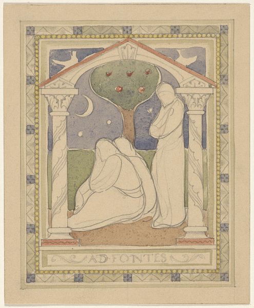 Editor: This ink drawing, "Meisje kust voor haar knielende Engelse soldaat," or "Girl Kisses her Kneeling English Soldier," by Albert Hahn, was created in 1918. I’m immediately struck by how this intimate scene is framed within such ornate, almost celebratory floral motifs. What symbols jump out at you here? Curator: The image presents a poignant juxtaposition of love and war, rendered through potent iconography. Note the kneeling soldier. Kneeling often denotes submission or reverence. Here, it's a nuanced symbol. Is it devotion to the girl, or does it perhaps subtly represent the vulnerable position of soldiers during wartime? And what of the kiss? Editor: It seems tender, but also urgent, like a farewell. Curator: Exactly. A kiss, universally understood as affection, here is tinged with the anxieties of wartime separation. Consider, too, the Art Nouveau frame. It's not merely decorative. Art Nouveau, emerging in response to industrialization, often evokes a yearning for simpler, more organic times. This drawing uses it to speak to the natural, enduring human need for love against the backdrop of mechanized war. Look at the birds interspersed in the foliage: What are they referencing, do you think? Editor: They remind me of doves, symbols of peace, scattered around a moment of human connection, like a prayer for tranquility amidst conflict. Curator: Precisely. Hahn layers symbols to speak to the complex emotions of the time. It’s a reminder of the personal amidst the political. What do you take away from the placement of the title “Sproetje”? Editor: Well, ‘Sproetje’ can mean ‘freckles’ – a reference to youthfulness, perhaps contrasting the innocence of youth with the brutal realities faced by this soldier. It creates a contrast, or dissonance, between the larger conflict and a simple love. Curator: I agree. The brilliance of such work lies in how artists like Hahn harness symbolic language to express universal emotions during times of upheaval. Editor: This close reading has really highlighted how symbols add depth to the emotion within a single moment. Thank you.
