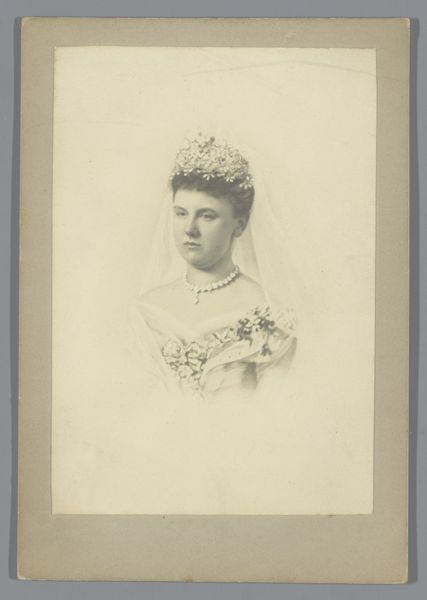 Editor: This is an albumen print from 1899, titled "Portret van koningin Wilhelmina," and credited to Wegner & Mottu, found at the Rijksmuseum. It feels very formal and almost…distant. What strikes you when you look at this portrait? Curator: Well, this image offers an entry point to discuss the performance of power and femininity at the turn of the century. Consider Wilhelmina's gaze. Does it meet yours directly, or is there a sense of detachment? How does this compare to photographic portraits of women outside the aristocracy during the same period? Editor: I see what you mean, she is looking at me, but she doesn't really seem to *see* me. Was she trying to project a certain image of herself? Curator: Exactly! Think about the construction of identity through photography. As a young queen, Wilhelmina was acutely aware of her image. Her carefully chosen attire, the pearl necklace and tiara, signal wealth, status, and dynastic continuity. We need to think about who this image was intended for and what messages it was supposed to convey to the Dutch public. How do you think gender plays into this image, considering the historical expectations of female monarchs? Editor: It’s interesting to consider it as a construction rather than just a likeness. Maybe she was trying to portray herself as a strong but also beautiful leader. Curator: Precisely! Now, thinking about Wegner & Mottu as the photographers, how do their own socio-political perspectives potentially intersect with and shape the image they created? It's rarely a neutral act. Editor: It is fascinating how many layers and ideas a simple portrait can contain! It is far more than what it appears at first glance. Curator: Indeed, this is where art history meets cultural studies. It's a potent reminder that images are never just representations; they are active participants in shaping our understanding of the world.