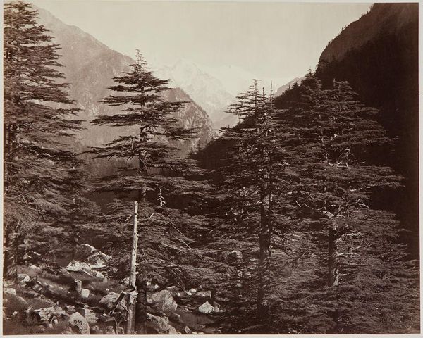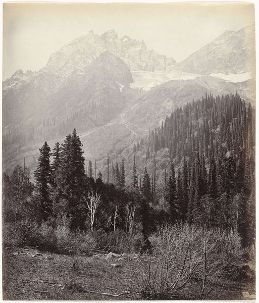 Editor: This photograph, "Torry's Peak" by William Henry Jackson, captures a sweeping mountain vista. It evokes a sense of awe, but also hints at the impact of human presence. What strikes you about this image? Curator: Jackson’s photographs were instrumental in shaping the popular perception of the American West. Consider that images like this circulated widely, fueling ideas about expansion and the "untouched" wilderness. How do you think these images influenced policy and settlement? Editor: So, it wasn't just about documenting, but also about promoting a specific narrative. It's interesting to consider the power that images held in shaping public opinion and ultimately, the landscape itself. Curator: Exactly. This photograph wasn’t just art; it was a tool in a larger cultural and political project. It leaves me wondering what the impact on indigenous populations was, as they were displaced.