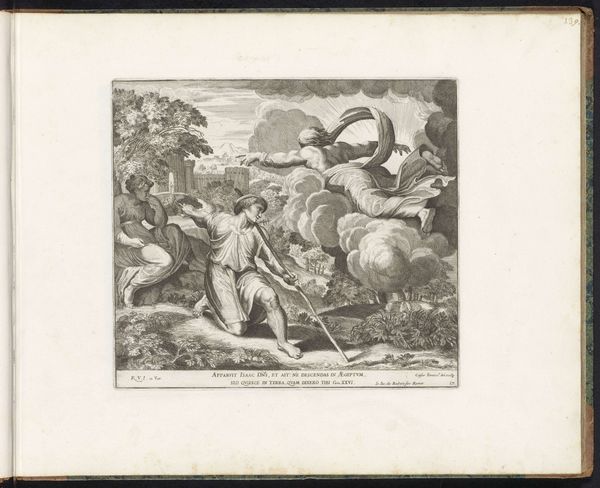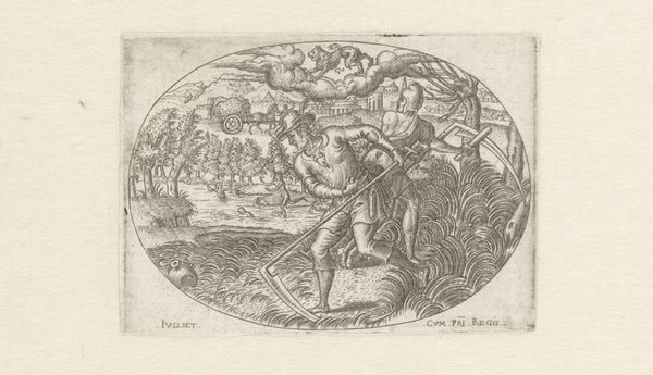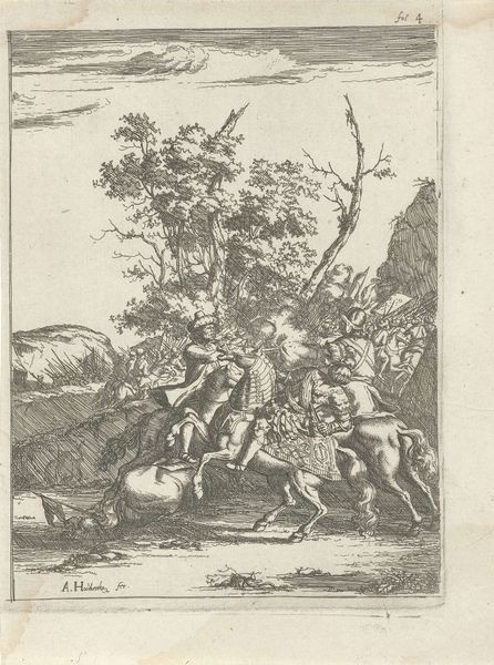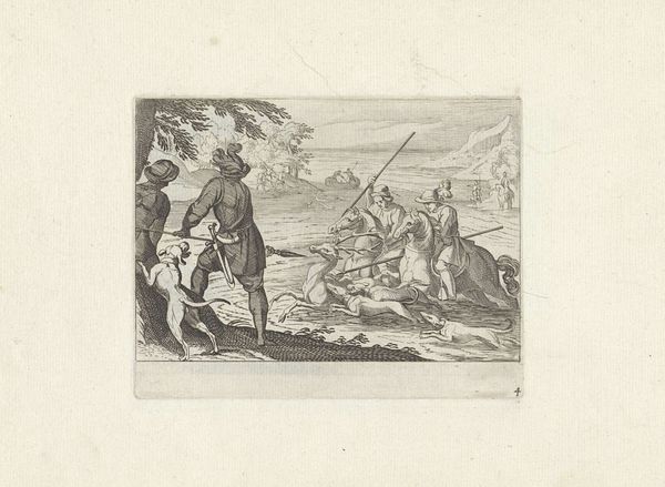 Curator: Oh, this print just plunges you into a different era, doesn't it? There's something so romantic, so brutally elegant about the whole scene. Editor: Elegance and brutality intertwined—that’s an astute observation. Here, we’re looking at “Jacht op herten,” or “Deer Hunting,” an engraving dating back to 1624, presently housed at the Rijksmuseum. Its authorship is unknown, which oddly adds to its mysterious allure. Curator: Unknown, but undeniably skilled. It's got that Old Master feel, a raw dynamism... Makes me think of desperate chases through ancient forests, echoes of trumpets and panting hounds. I can almost feel the chill in the air! Editor: Indeed. The composition is masterfully structured. Observe how the artist uses diagonal lines to convey motion, guiding the viewer's eye from the hunters in the background, past the central figure poised with his spear, to the chaotic scene of the deer struggling in the water. Curator: Chaotic, yes, but notice how even that chaos is contained. There’s this incredible balance, a visual harmony amidst the frenzy. I love how the landscape, the backdrop of rolling hills, is just as alive as the figures. Everything is interconnected. What do you reckon the river does in it all? Is it like a washing away? Editor: The river serves multiple functions, symbolically acting as both a boundary and a site of cleansing. But more importantly, I would highlight it structurally – look at it function as a reflecting plane that accentuates and destabilises perspective. Curator: I guess sometimes you need to get the details straight, huh. It's a stark scene, for sure, no room for misunderstanding the drama! Editor: Drama which derives from a deeply embedded structural logic—its appeal stems precisely from how skillfully it uses form to narrate violence. Curator: So, a little violence is always a winner… Just joking, I still find that such works prompt all the ethical questions about man's relationship with nature. It seems to never get old in time. Editor: Precisely, the work manages to capture multiple ideas—structural sophistication, dynamic motion, but also that ethical uncertainty—all intertwined within this little framed narrative.