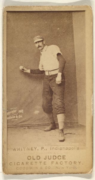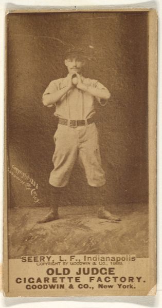 Editor: Here we have "Boyce, Catcher, Washington, from the Old Judge series" an albumen print from 1888, produced by Goodwin & Company. It's a baseball card, really, and I'm struck by how staged it feels. He's sitting on a rock like a Victorian portrait. What's your read on this piece? Curator: Well, let's consider this baseball card not just as a piece of sports memorabilia, but as a window into late 19th-century masculinity and consumer culture. This image, reproduced on cigarette cards, was a tool for promoting not just a sport, but a particular vision of American identity tied to ideals of athleticism, strength, and even capitalism. Who was this image intended to appeal to? Editor: Cigarette smokers, presumably! The text says Old Judge Cigarettes so I suppose it was targeted to baseball fans who also smoked, mainly men I imagine. Curator: Precisely. And how might the staging contribute to that message? Notice the carefully constructed pose, almost like a Greco-Roman sculpture. This wasn't just about showcasing athleticism; it was about elevating the baseball player to the level of a classical hero. What do you think that communicated about American ideals at the time? Editor: So it wasn't just about baseball; it was about associating these players with an older ideal, one that maybe implied good character or something. The photo would have suggested a strong, dependable figure. Did it affect who could imagine themselves as a ‘real’ American? Curator: Absolutely. And let's consider who *isn't* in this picture. Whose stories are left untold in these idealized images of baseball and American masculinity? That absence is just as telling as what's presented. Editor: That makes me see it very differently. I thought it was just a baseball card, but now I understand it’s more about social and gender constructions from that time period. Thanks! Curator: It reveals to us, the complex narratives of identity and representation that continue to shape our society. There is always a larger narrative at play if you start digging!