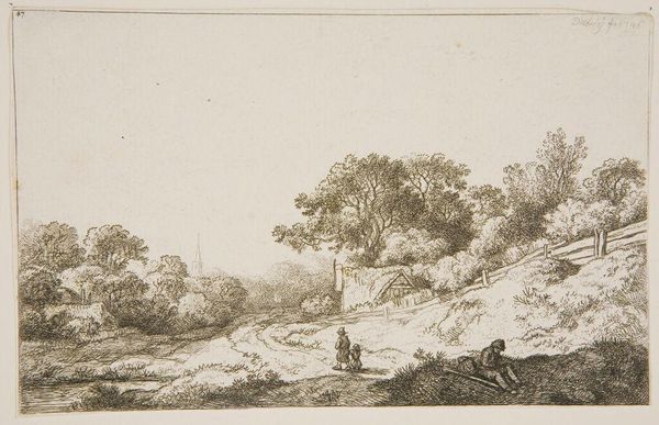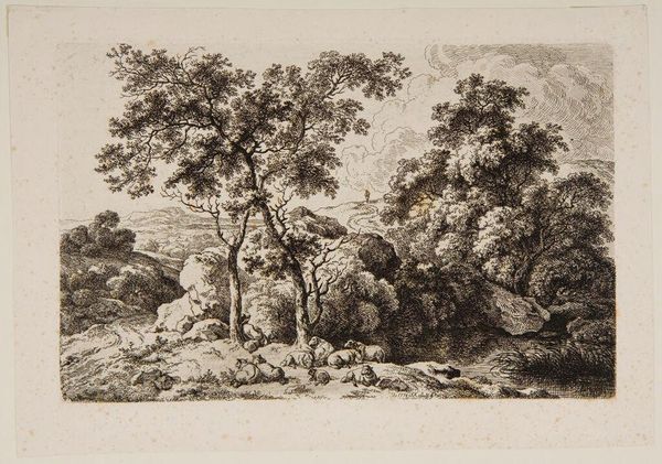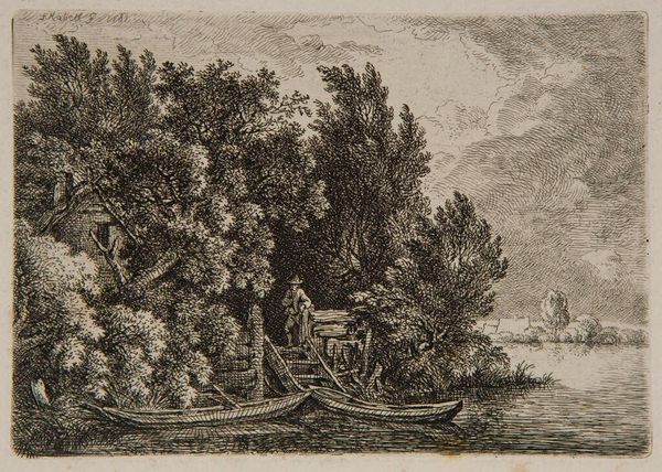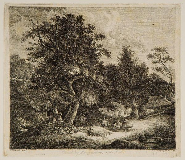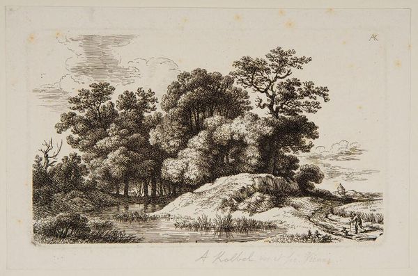 Curator: Anton Kölbl's etching, “Wood Choppers,” presents a landscape scene dominated by dense foliage and a subdued palette. Editor: It certainly evokes a sense of somber introspection. The tight cross-hatching and muted tones give the entire composition a feeling of heavy stillness. Curator: Observe the artist's use of line and texture to create depth and volume. The density of the trees contrasts with the open sky, creating a dynamic interplay of light and shadow. Editor: Yes, but beyond the formal elements, consider the cultural implications. Wood choppers historically symbolize both provision and destruction. They are figures of transformation. Curator: A compelling point. Yet, I'm drawn to the way Kölbl manipulates the materiality of the etching itself to create such a striking composition. Editor: It's fascinating how a simple scene can hold such complex cultural weight. Food for thought. Curator: Indeed, a testament to the power of artistic vision and masterful technique.