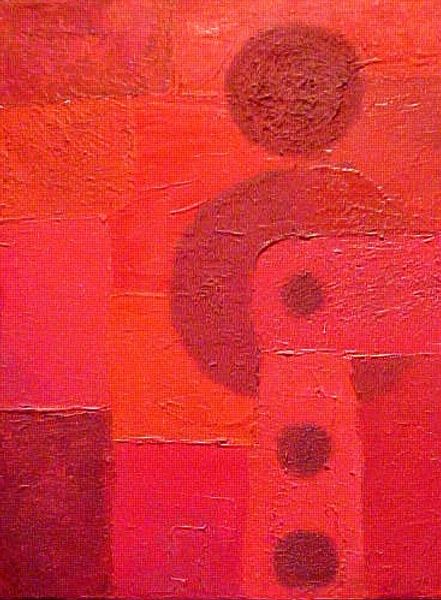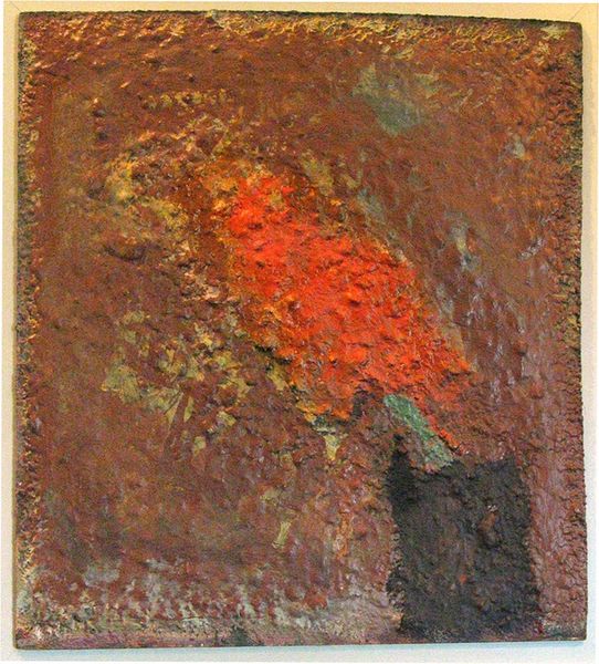 Curator: Here, we have Joan Miró's 1968 work, "Hair Pursued by 2 Planets," a compelling example of his exploration into the cosmos using acrylic paint. Editor: It's almost a landscape. Fields of green brushed and stroked every which way, wild, chaotic, but there is this...menacing eye watching it. Or two, technically, I suppose. Curator: Interesting observation! Let’s consider Miró's materials here. The acrylic application appears almost like impasto, providing the backdrop with a rich textural feel, the brushwork contributing to the movement and vitality. Editor: Yeah, you feel like you can stick your finger right in that texture, and I do want to, actually! It gives the field a really intense vibrating sort of presence. Like it’s not quite stable under the planetary gaze. Curator: The use of bold orange against the field of green underscores a clear dichotomy and hierarchy, reminiscent of natural cycles or even industrial encroachment upon the natural environment. These stark contrasts are essential to interpreting the work in its socio-political moment, with growing tensions in a period of change. Editor: I like thinking about this poor patch of hair on the run from cosmic judges who may squash you under foot for any stray move you may consider, a bit theatrical. But on the other hand, that intense green backdrop suggests hope, doesn’t it? Curator: Possibly. The work encourages us to consider not only the act of artistic production but also how such materials reflect social anxieties and the search for equilibrium during the late 1960s. It questions conventional definitions and labor. Editor: And isn't that the beauty of Miró? Making serious inquiries disguised as playtime, with simple strokes loaded with meaning that still allow my imagination plenty of room to wiggle. Curator: Agreed, Miró’s clever use of color and material opens conversations about production, labor, and consumption that push against purely aesthetic interpretations of "Hair Pursued by 2 Planets." Editor: Yes. This piece whispers to me, I need time to hear it better, with its bizarre energy and simple shapes creating profound emotion.