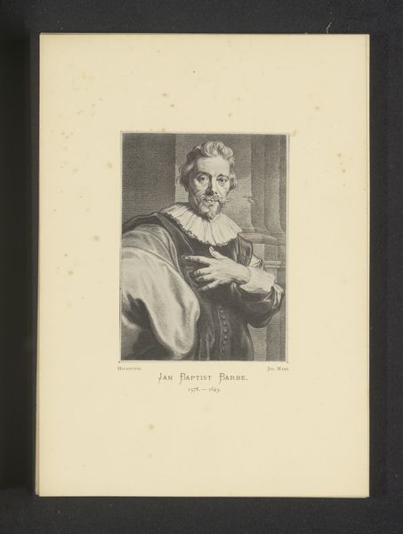Editor: This is a reproduction of an engraving, created before 1877 by Joseph Maes, of a portrait of Simon de Vos by Paulus Pontius. It's monochrome, mostly shades of grey, and has such incredible detail. I'm immediately struck by the contrast between the dark background and the ruffled collar. How do you see this portrait, through a formalist lens? Curator: Indeed, the engraver masterfully uses line weight and density to simulate volume and texture. Observe how the density of the etched lines modulates, defining the form of the sitter's face and clothing, particularly the collar, as you mentioned. Notice the texture around the eyes, that provides depth to the person depicted in the print. Are you observing that contrast, and how that technique enhances the dramatic effect? Editor: I do. It also draws the viewer's eye toward Simon de Vos' face, as well. So, you're suggesting that these formal choices-- the contrast, the hatching-- these elevate the subject, almost in a Baroque theatrical way? Curator: Precisely. It's not just a representation; it's a carefully constructed image relying on tonal values and textures to create a presence. This print has a physical presence by the decisions in these dark blacks to the pale grey to bring Simon to life. This manipulation allows Maes to give the portrait life and depth. Editor: That is fascinating! Thank you for pointing out that physical presence. Curator: And thank you for engaging with me, so insightful of you.