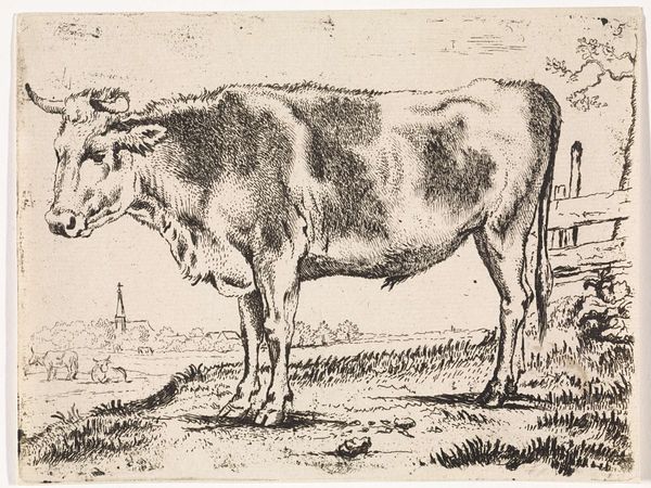 Curator: Oh, isn’t that something? You get the sense these two are having a serious disagreement! Editor: Indeed. What we're looking at is a print titled "Two Bulls Fighting," etched by Paulus Potter during the Dutch Golden Age. There's a tension, a charged energy within the lines of the drawing itself. I imagine this was not simply documentation. Curator: Absolutely. I find a rough sort of beauty here, the starkness of the scene almost poetic. It is more of a dance, even with the apparent aggression; this really captures a powerful moment in time. You almost hear their huffs and the pounding of their hooves, I mean, really raw primal power that sends chills down your spine! It reminds me of every argument I’ve ever had… all energy, passion, stubbornness, and then a grudging respect once the dust settles. Editor: The realism, while typical of Potter's style, also speaks volumes about the period. The Dutch Golden Age witnessed a burgeoning mercantile class eager to see the natural world, particularly agricultural life, depicted with scientific accuracy. The fighting bulls become, in a sense, a mirror reflecting society’s concerns with land ownership, competition, and even a certain romanticization of rural life juxtaposed against urban expansion. Curator: It is so visceral! Potter renders these massive animals in a such detail, their muscles flexed and ready. The texture in this work— the paper feels almost soft to the touch even when it isn’t! Editor: The piece offers layers to dissect— gendered symbolism is something else to chew on, isn't it? The bull, a classic symbol of masculinity and virility, here locked in a power struggle. There is almost a sort of violent ballet of dominance happening, one very performative. The way these fights mimic the way gender and patriarchal power present themselves... Curator: Yes, and maybe we could even question the performativity inherent in depictions of masculinity itself, then and now. It’s more than just bulls locking horns; it is something universal. This speaks of primal forces still with us. Editor: Definitely, a small print with huge resonance and a complexity that asks us questions that go far beyond the pastoral.