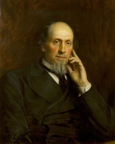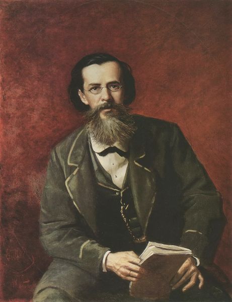Editor: This is Ivan Kramskoy's "Portrait of the Poet Nikolai Nekrasov," painted in 1877 using oil. I’m struck by the sitter's reserved and contemplative expression and the very somber coloration. What can you tell me about what’s going on here? Curator: Let us focus on the formal elements first. Observe the brushwork; Kramskoy uses subtle gradations of tone and almost imperceptible brushstrokes to achieve a realistic likeness and muted texture. This, combined with a restrained palette, creates a quiet intensity. Consider also how the composition directs our gaze—the crossing of Nekrasov's arms creates a stable triangle, drawing attention to the central mass. How does this compositional strategy contribute to the overall mood of the work, in your opinion? Editor: I think that subdued feeling might come from the palette; he seems to be restricted to browns, blacks, and greys, lending itself to a reserved emotional climate. It’s more subdued and straightforward. Curator: Precisely. Moreover, it is vital to consider that by simplifying the composition to these basics, and controlling color, texture, and line, Kramskoy communicates something profound with such simple tools. Notice also that this reduction serves to enhance the expressiveness of Nekrasov's gaze, which emerges as the focal point. How would the piece differ had Kramskoy chosen an explosion of vibrant color? Editor: I think a painting that chose a brighter palette may seem more extroverted or dynamic. This is thoughtful. Curator: It's true; these subdued tones are intentional artistic decisions that amplify the seriousness and interiority of Nekrasov’s presence. Kramskoy’s understanding of the relationship between form and meaning is quite apparent. Editor: I never thought that restraint itself could communicate something so directly. Curator: Well, these simple features create a rich story. A lesson in simplicity perhaps.