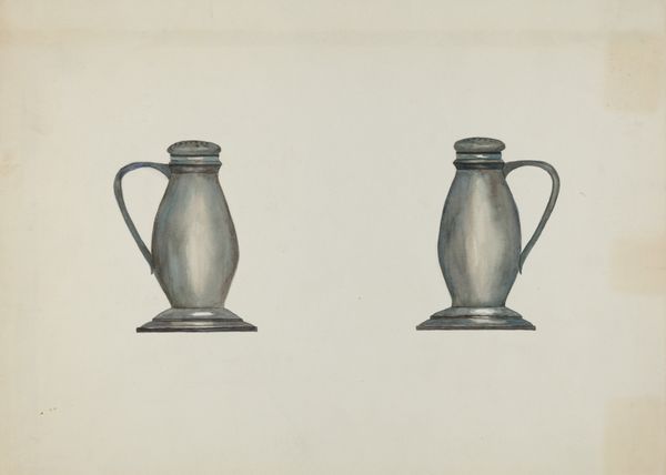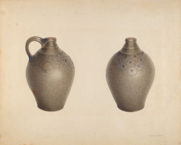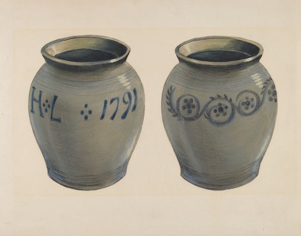 Fred Weiss created this gouache painting of a Batter Jar, sometime between 1855 and 1995. The composition is dominated by two vessels, rendered in muted blues and greys against a neutral backdrop, evoking a sense of stillness. Each vessel mirrors the other, one featuring handles and a spout. They are both subtly decorated with painted swirls and the date 1790. Weiss's choice of gouache allows for a flat, opaque texture that emphasizes the solid form of the jars. This invites us to consider how materiality informs meaning; the pottery's utilitarian function contrasted against its decorative embellishments. Weiss seems interested in exploring the semiotic relationship between form and function, challenging traditional notions of artistic value and representation. Notice how Weiss uses subtle variations in tone and shading to create depth, hinting at the complex interplay between representation and abstraction. It reminds us that art exists within an ongoing dialogue, constantly re-evaluating its own structures and meanings.