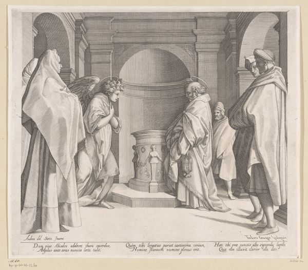 Curator: Before us is "Christian Martyrs Being Carried Away," an engraving produced between 1870 and 1883 by Heinrich Nuesser. What strikes you initially about this work? Editor: It's starkly melancholic. The figures seem burdened not only by the weight of the body they carry, but also by profound sorrow. It speaks to the pervasive oppression of the early Christian community. Curator: Note the deliberate compositional structure. The pallid body of the martyr serves as a central visual anchor, creating a strong horizontal axis. What we call pyramidal grouping contributes to a sense of balance and order, counteracting the emotional chaos. Nuesser employs delicate gradations of tone to build form. How do you interpret that decision? Editor: The subdued palette amplifies the solemnity, certainly. But I think it’s vital to recognize how the martyr's passivity functions within the larger narrative. This echoes historical patterns of female martyrdom often portraying women as docile, voiceless symbols. How might the image empower, or disempower, early female Christians? Curator: It raises intriguing questions. Yet we must recognize the work exists in a period when history-painting conventions and romanticism were being expressed together. Look at how the scene is arranged under an arch. Nuesser emphasizes architectural elements to create depth and define the visual field. There's a carefully calibrated relationship between light and shadow too, wouldn't you agree? Editor: I do. However, those dramatic contrasts could be interpreted as reflecting the polarized experiences of privileged and persecuted people, of patriarchal narratives versus lived experience. Even in art, systems of power are inscribed, subtly, often without critique. How does the piece challenge or uphold contemporary values about social justice, do you suppose? Curator: It’s difficult to impose contemporary criteria upon art historical periods lacking such established vocabularies. By appreciating the balanced arrangement and tonal qualities, we begin to engage the composition on its own terms, to understand something more profound than political sentiment. Editor: Maybe, but sometimes those tonal arrangements hide more insidious messages that should be interrogated instead of excused for being “of their time.” What kind of activism did a scene like this provoke, what resistances were inspired? Curator: Regardless, one cannot deny Nuesser's technical ability, his mastery of form... Editor: Indeed. The piece still compels reflection, even debate, regarding the ongoing significance of resistance.