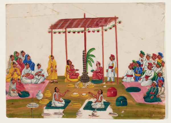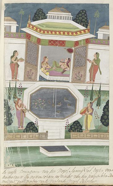 Editor: We’re looking at "Bani Thani Bathing at Pholl Sagar Palace," a watercolor painting made sometime between 1810 and 1820 by an anonymous artist. It has such a serene, almost dreamlike quality to it. All these figures are arranged within a lush, verdant landscape. What do you see in this piece? Curator: It feels like stepping into a memory, doesn’t it? The painting is a gem of the Kishangarh style, known for its idealized beauty. Bani Thani herself, the muse, embodies the perfect woman. What strikes me is the incredible detail juxtaposed with this feeling of naive art, almost a folk-tale quality. Look at her elongated features, the arched eyebrows… everything emphasizes her otherworldly grace. What do you make of the architectural elements? Editor: The pavilion is beautiful! And is that a palace off in the distance on the right side of the painting? It’s quite small, maybe that gives a feeling of naive art that you pointed out? The figures almost blend into the natural world. But why the bathing scene, specifically? Curator: Ah, the bathing…it’s more than just hygiene, isn't it? Water, in many traditions, is symbolic of purity, renewal, and life. Perhaps this moment captures a sort of divine beauty intertwined with everyday life. Consider also that the palace, the trees, everything is almost a character, too, each part participating in this elegant dance. Do you notice the slight asymmetry? Editor: Now that you mention it, yes! It gives the composition an unusual sense of movement, preventing it from feeling static, even with such meticulous detail. It also emphasizes Bani Thani at the pavilion since all the subjects gravitate around her. Curator: Exactly! And that asymmetry makes the experience more intimate, almost like a stolen glance into a private world. It's beautiful. It feels both epic and personal. Editor: This really encourages me to appreciate art as a multi-sensory experience. This isn't only a landscape. It's almost a stage for understanding royal culture and individual beauty, both things combined within a shared activity. Curator: That's perfectly said. Sometimes, a simple scene of people near the water captures humanity itself.