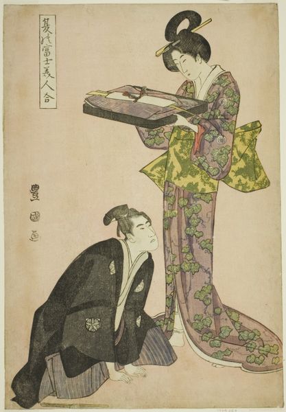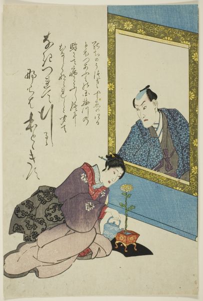 This memorial portrait of Ichimura Takenojo V and an unidentified actor was created by Utagawa Kunimaro I. The composition is dominated by pale hues, and the flat application of color emphasizes shape and line over depth, drawing our attention to the formal structure of the print. The figures are arranged to create a dynamic visual rhythm. The actor in blue, seated regally with a hint of melancholy, is juxtaposed against the second actor in a lower register looking up with adoration. Note how the lines of their garments and the objects around them lead the eye around the scene. The column of smoke that rises vertically on the lower right side of the portrait reinforces this dynamic. The calligraphy, though indecipherable to many of us, adds another layer of visual texture, balancing the figurative elements. This piece challenges fixed meanings by inviting a meditation on theatrical performance, memory and the ephemeral nature of fame.