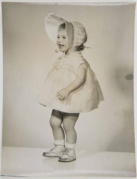 Curator: This small, untitled photograph by Lucian and Mary Brown features a young girl in a plaid dress, frozen in a moment of what seems like pure, unadulterated play. Editor: There's a ghostly quality to this image, a sort of haunting captured in the child’s extended hand and the faded details of the room. It evokes a strong sense of temporality. Curator: Indeed. The contrast between the sharp focus on the girl and the soft background really draws your eye to her movement, like she's about to twirl right out of the frame. Editor: I'm also drawn to the wallpaper. It’s a domestic space, yet the high-key lighting almost erases the subject as an individual, emphasizing instead the social construction of childhood. Curator: It's a delicate balance, isn’t it? The Browns capture this intimate moment, but that stark lighting you mentioned elevates it beyond the personal, almost to an archetype. Editor: Precisely, it’s a reminder that even seemingly simple snapshots can carry a lot of complex weight about how we view innocence and belonging. Curator: It leaves me wondering about her story. What was she thinking in that moment? It’s a quiet, powerful question that resonates beyond the frame. Editor: Yes, and in a way, the lack of a title lets us project our own narratives onto her, connecting our own experiences to this fleeting, photographic instant.