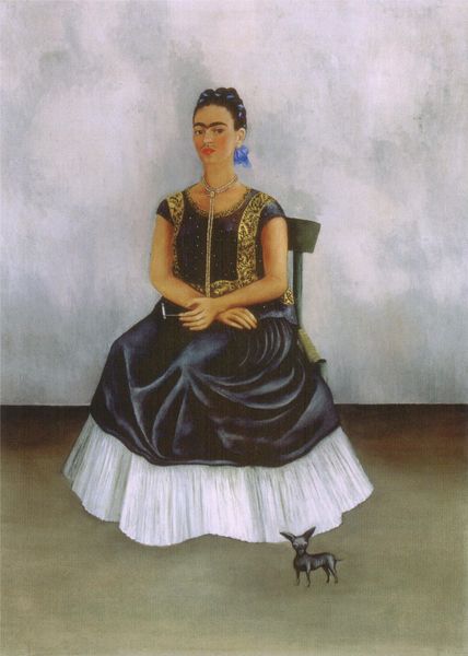 Editor: Frida Kahlo's 1931 painting, "Frieda and Diego Rivera," is an oil on canvas. The portrait depicts Frida and her husband, Diego Rivera, holding hands. I'm struck by the formality of their poses and the stark contrast between Frida's vibrant attire and Diego's somber suit. What do you see in this piece? Curator: This is more than just a portrait; it's a declaration of their complex relationship and their place within Mexican society. Kahlo often used her art to explore themes of identity, gender, and power. Notice how Diego, the famous muralist, is depicted with symbols of his art, while Frida stands beside him, her gaze direct and assertive. The inscription above them, referencing their marriage date, grounds the artwork in a specific moment, but also speaks to the enduring, though often turbulent, nature of their bond. Kahlo’s choice to represent herself in traditional Tehuana dress asserts her indigenous heritage, a significant political statement in post-revolutionary Mexico, challenging colonialist aesthetics and celebrating Mexican identity. Editor: It's fascinating how she weaves personal and political threads so seamlessly. I appreciate seeing her assert her heritage so boldly. Curator: Exactly. Her work challenges us to consider the intersection of personal experience and broader social forces. It’s a powerful example of how art can be both intimate and political.