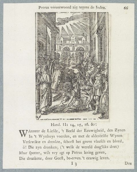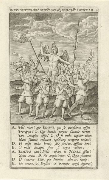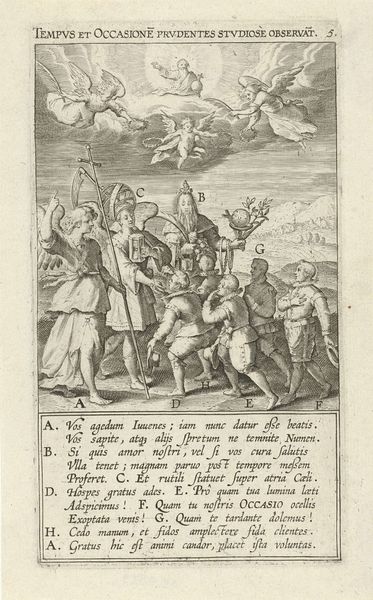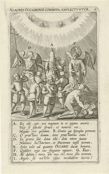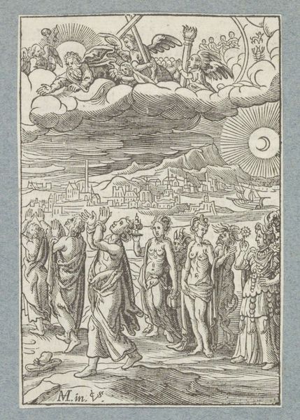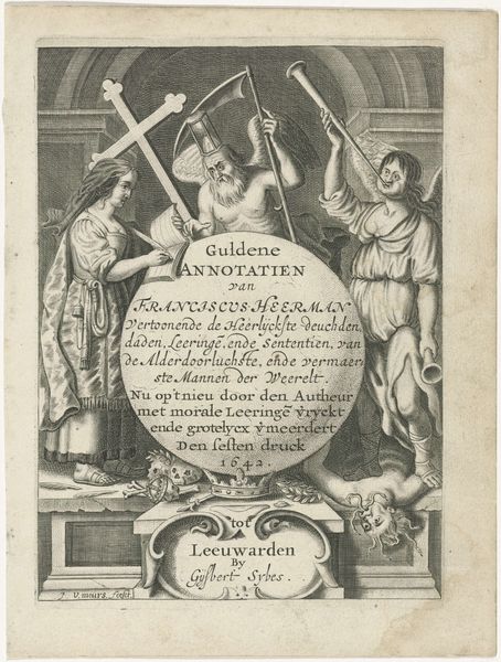 Editor: We're looking at "Christus aan het kruis en de Dood," or "Christ on the Cross and Death," an engraving by Christoffel van Sichem II, dating to 1629. It's stark, high-contrast, and unsettling with a very prominent skeleton holding a sword at the bottom right. What do you see when you look at this print? Curator: It's impossible to ignore the material reality embedded within this devotional image. We must acknowledge the economic engine driving its production. How many of these prints were made? Who bought them, and for what price? The labor of Sichem himself – a skilled artisan navigating the burgeoning print market. Editor: So you're less interested in the religious meaning and more in the production itself? Curator: Not exclusively, but to divorce it is to misunderstand its place within society. The type of ink used, the quality of paper...these things dictated its affordability and reach. Look at the detail - achievable because it's a *print.* The lines defining Christ’s body, the expressions of the figures... This speaks to skill but also a commercial demand for emotionally evocative religious imagery. What type of market made it profitable to create imagery such as this? Editor: I guess I never thought of a crucifixion scene as driven by profit, but it makes sense when you break it down to the materials and labor. Curator: Exactly. And that commercial element doesn't invalidate the potential religious impact; it informs it. Consumption and faith intertwine in the tangible object. By engaging with the materials and processes, we uncover deeper understandings of not just the art, but also its intended audience. Editor: I think that completely changes how I'll look at prints moving forward! Focusing on the means of production is just as important as subject. Curator: Precisely.